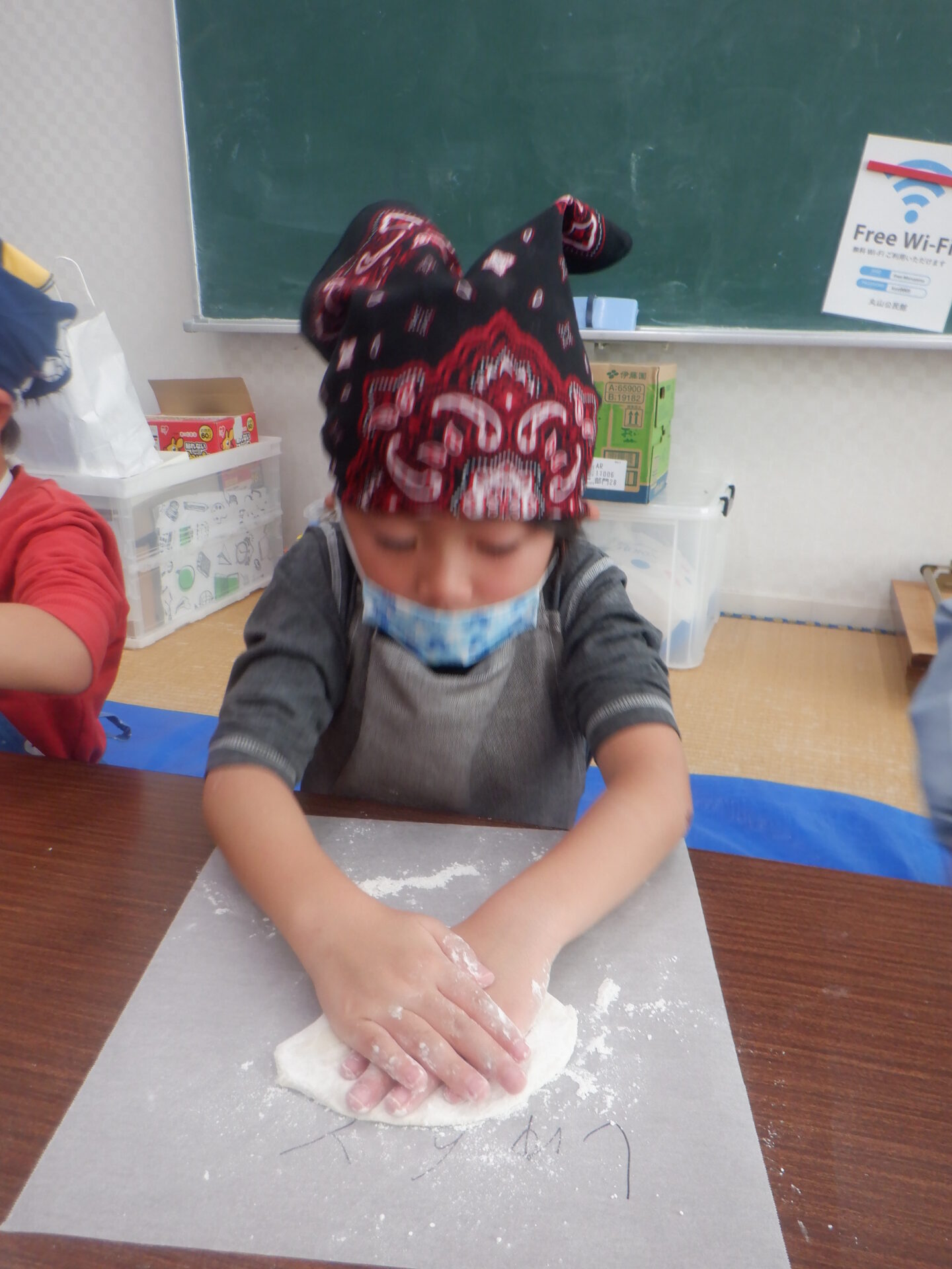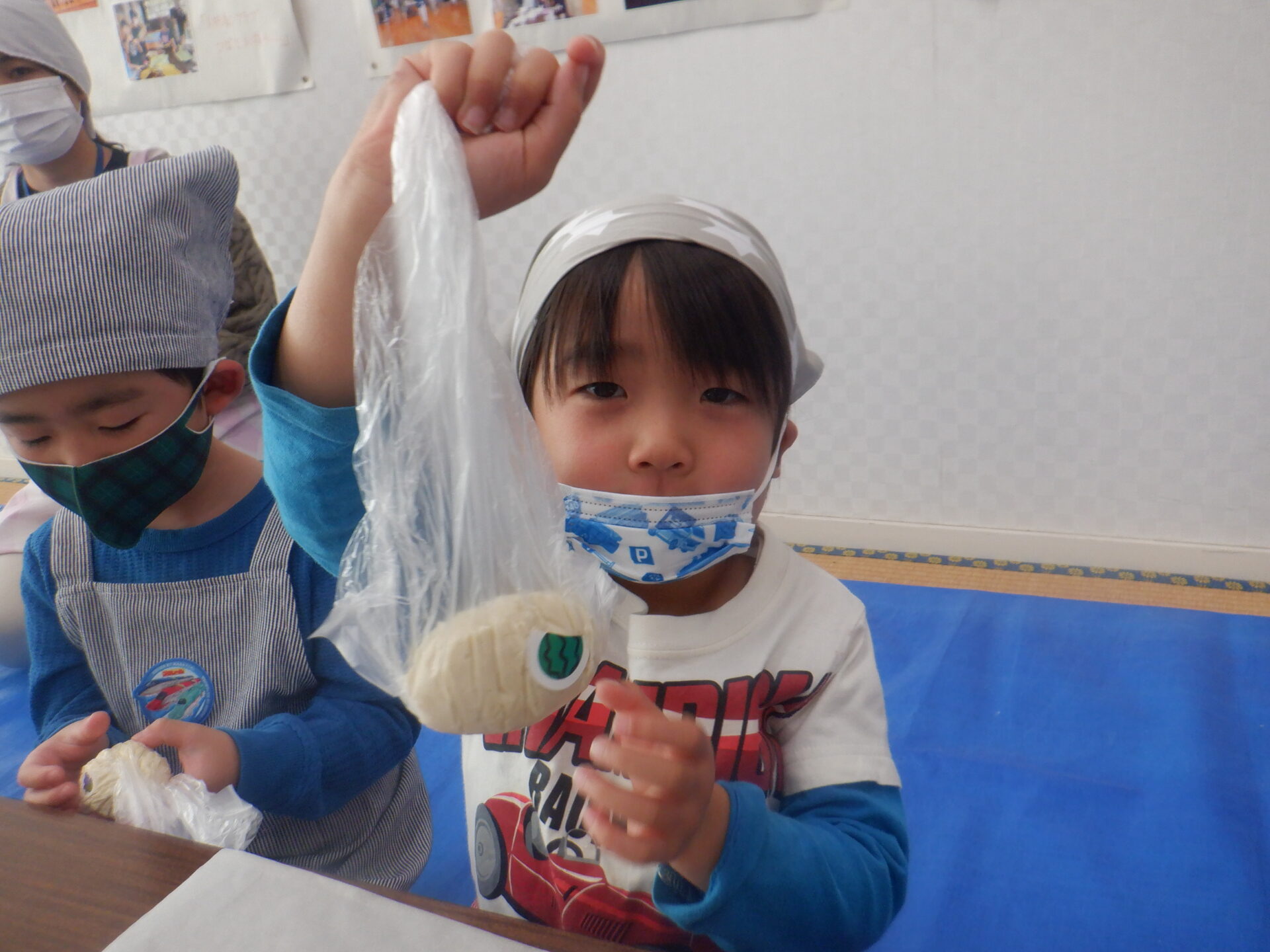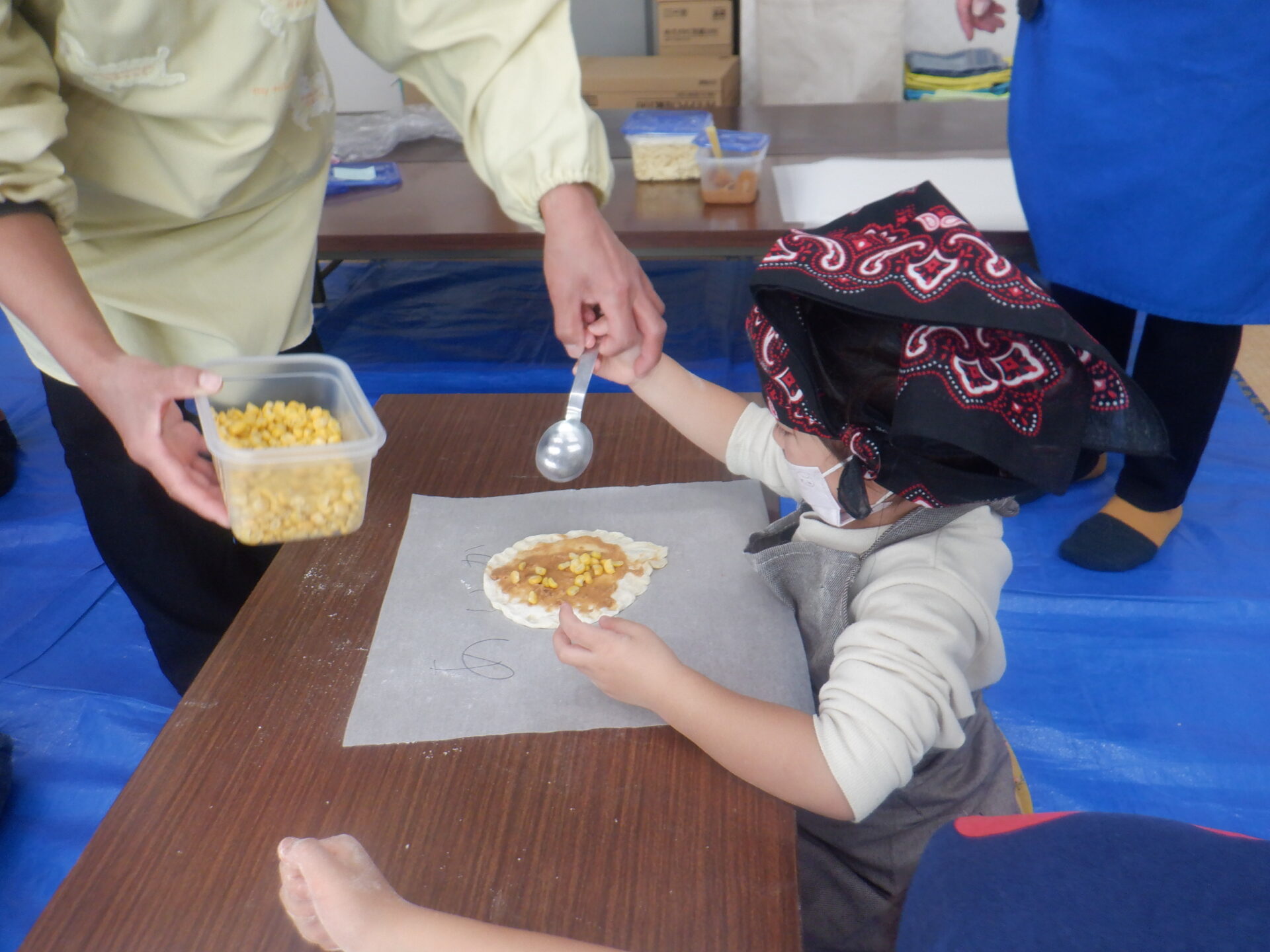 公民館のお部屋を借りてピザ作りです。保育園を出たときよりも少し大きくなったみたい。