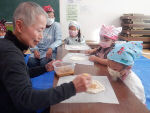 クッキングシートに粉を敷いて伸ばしていきます。同じ厚さに伸ばすのは難しいので、職員や石窯部の皆さんにもお手伝いしてもらいました。