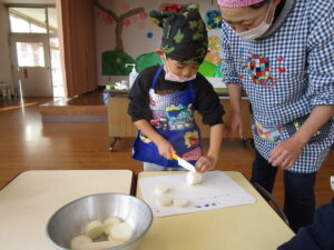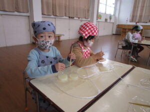 ・凍み大根作りでは「外に干しておくと大きくなると思う?小さくなると思う?」と尋ねると「大きくなる!」「小さくなる!」と答えた子が半々でした。今後、実体験を通して大根の変化や凍み大根の感触や味の違いにも気づいていけるのではないかと思う。