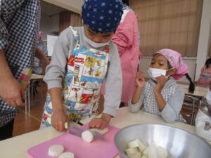 今年、3回目のクッキングの年長さん、包丁の使い方がとても上手になってきました。今回は半月切りに挑戦しました。