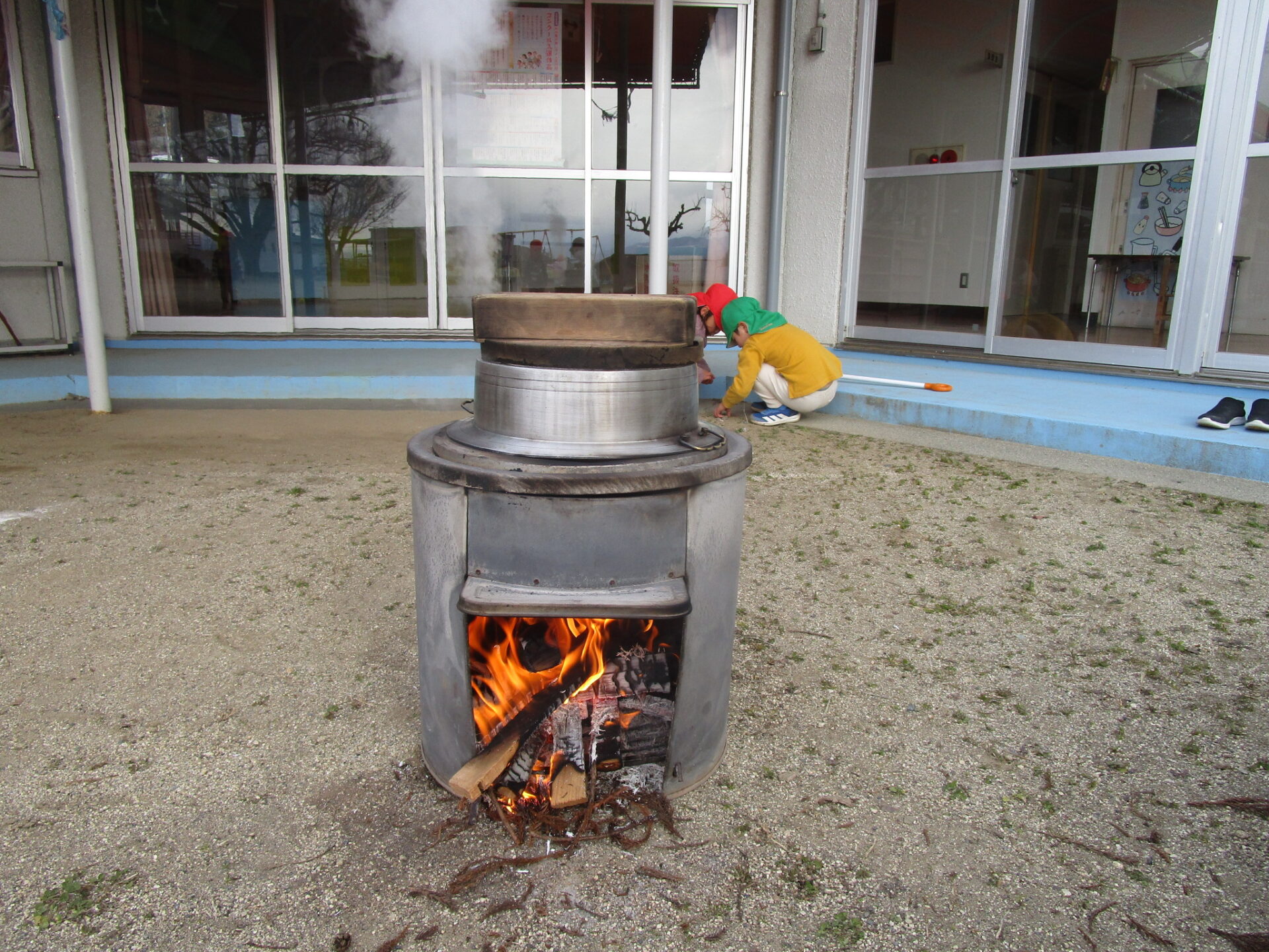 皆で味見するように園長先生が竈で茹でてくれました。