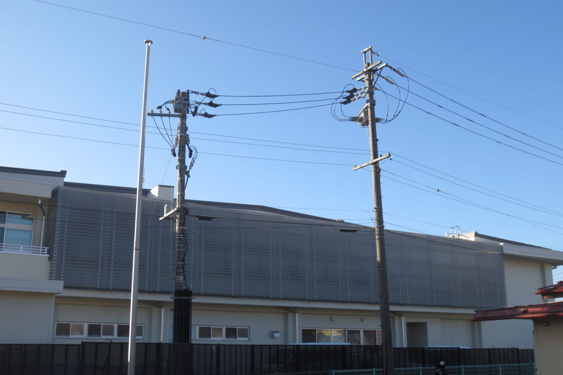 「あそこの上!(支所の屋根の室外機)」