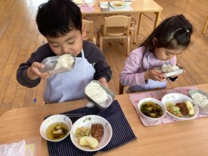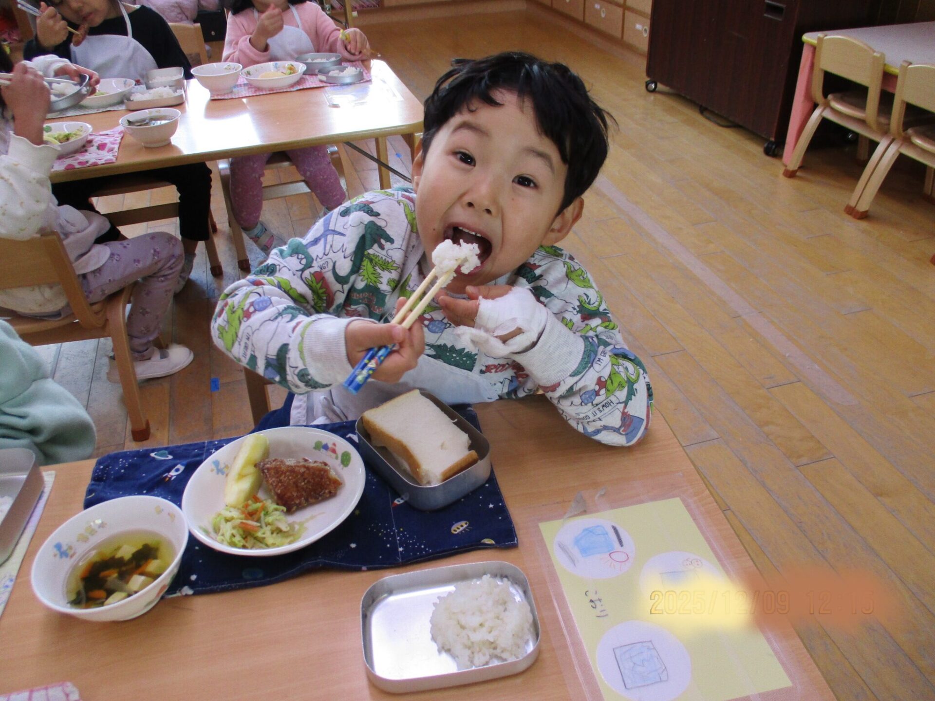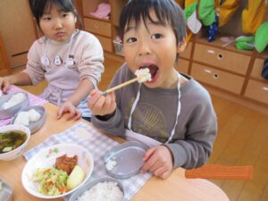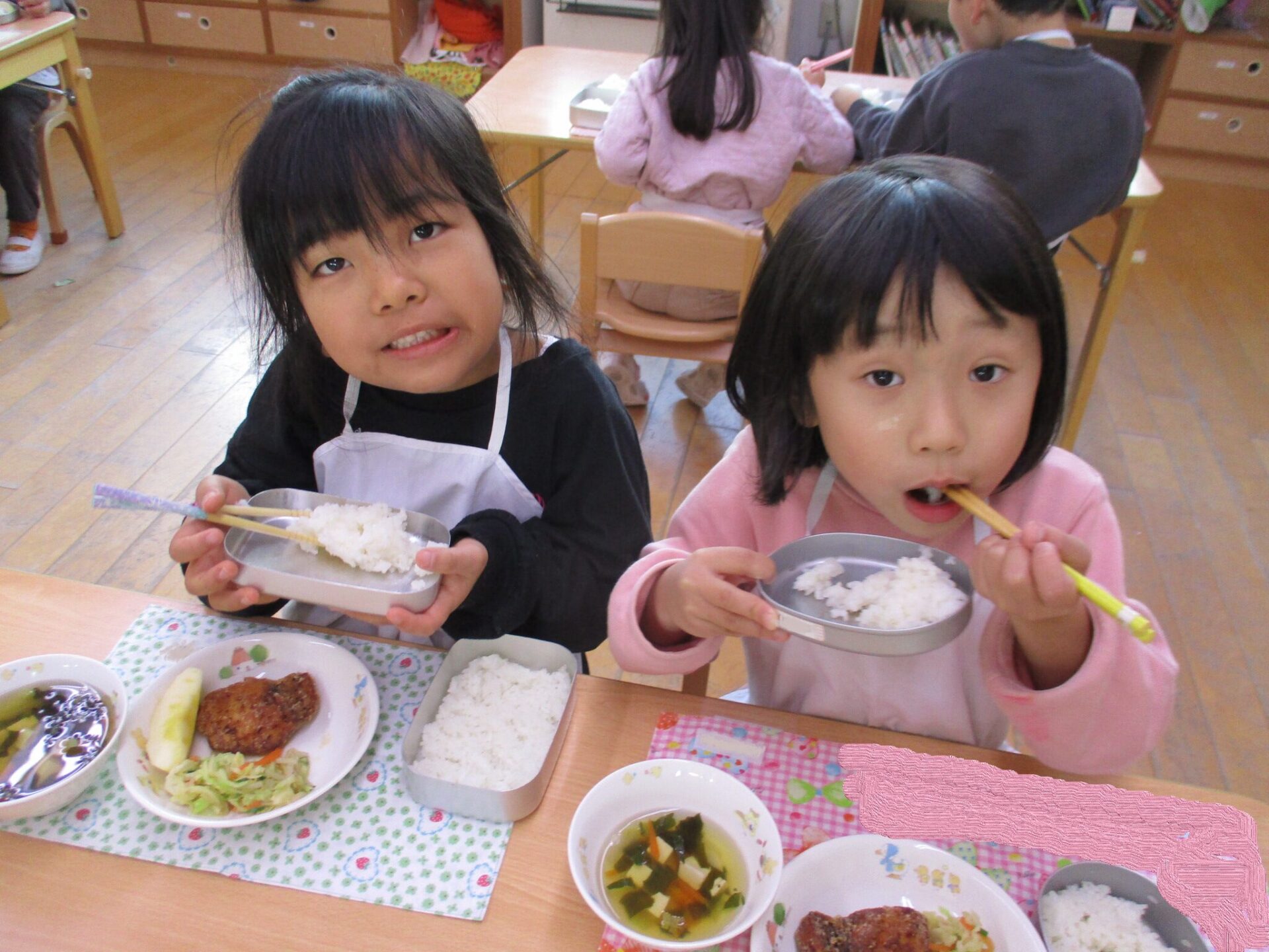 給食の先生に炊いていただき、いよいよ食べられる日が来ました。