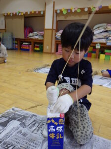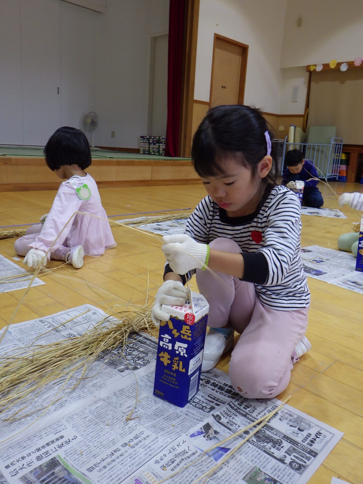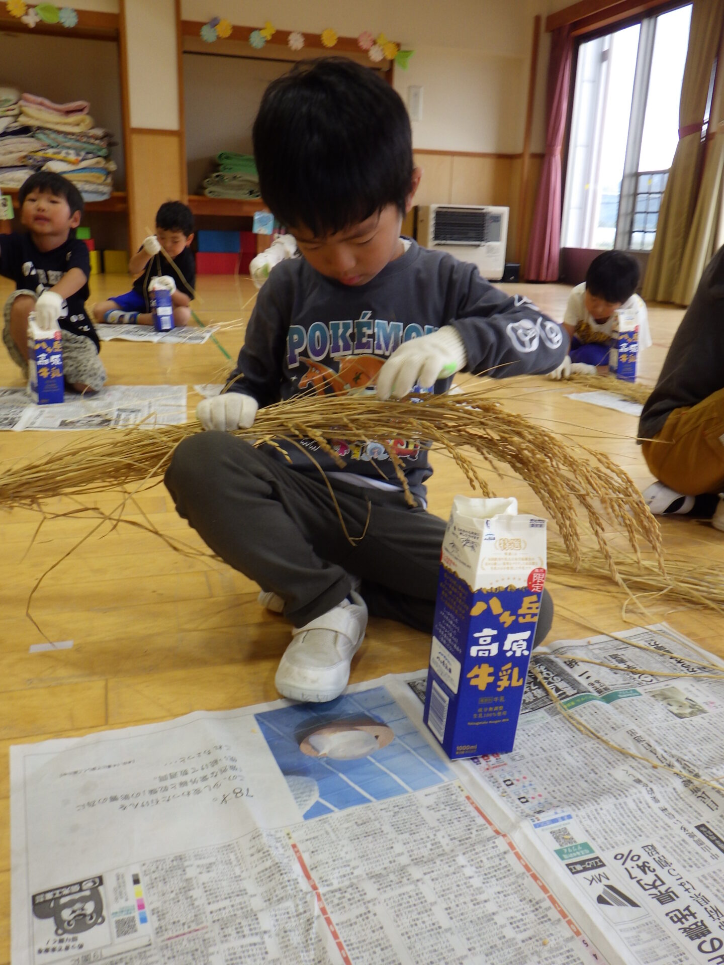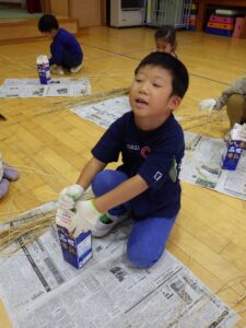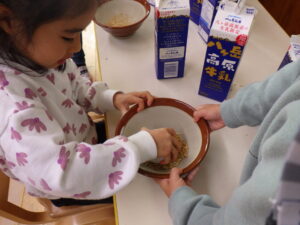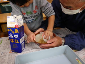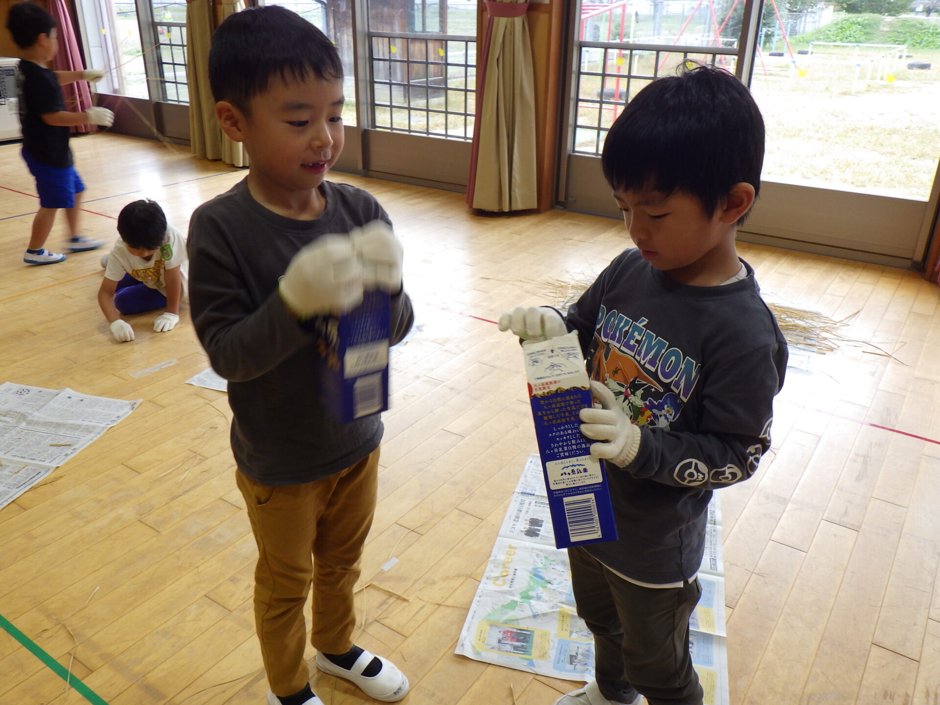 はぜかけから1ヶ月ほど経ち、今度は牛乳パックを使って脱穀をしました。パラパラともみが取れる音がすると「取れた!」と嬉しそうでした。
