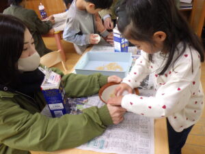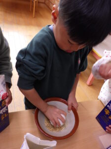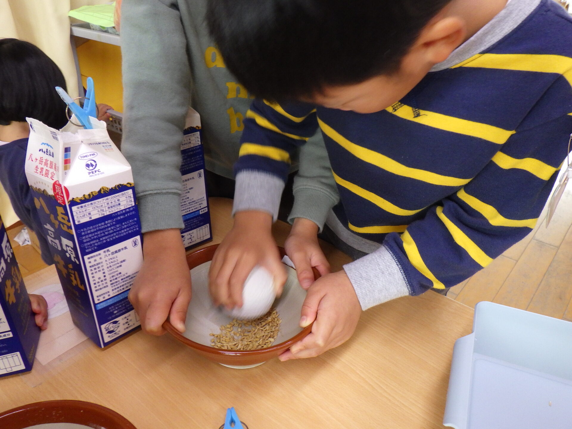 またもみすりでは、すりばちとボールを使うことに驚き、不思議さを感じながらもみすりをし、