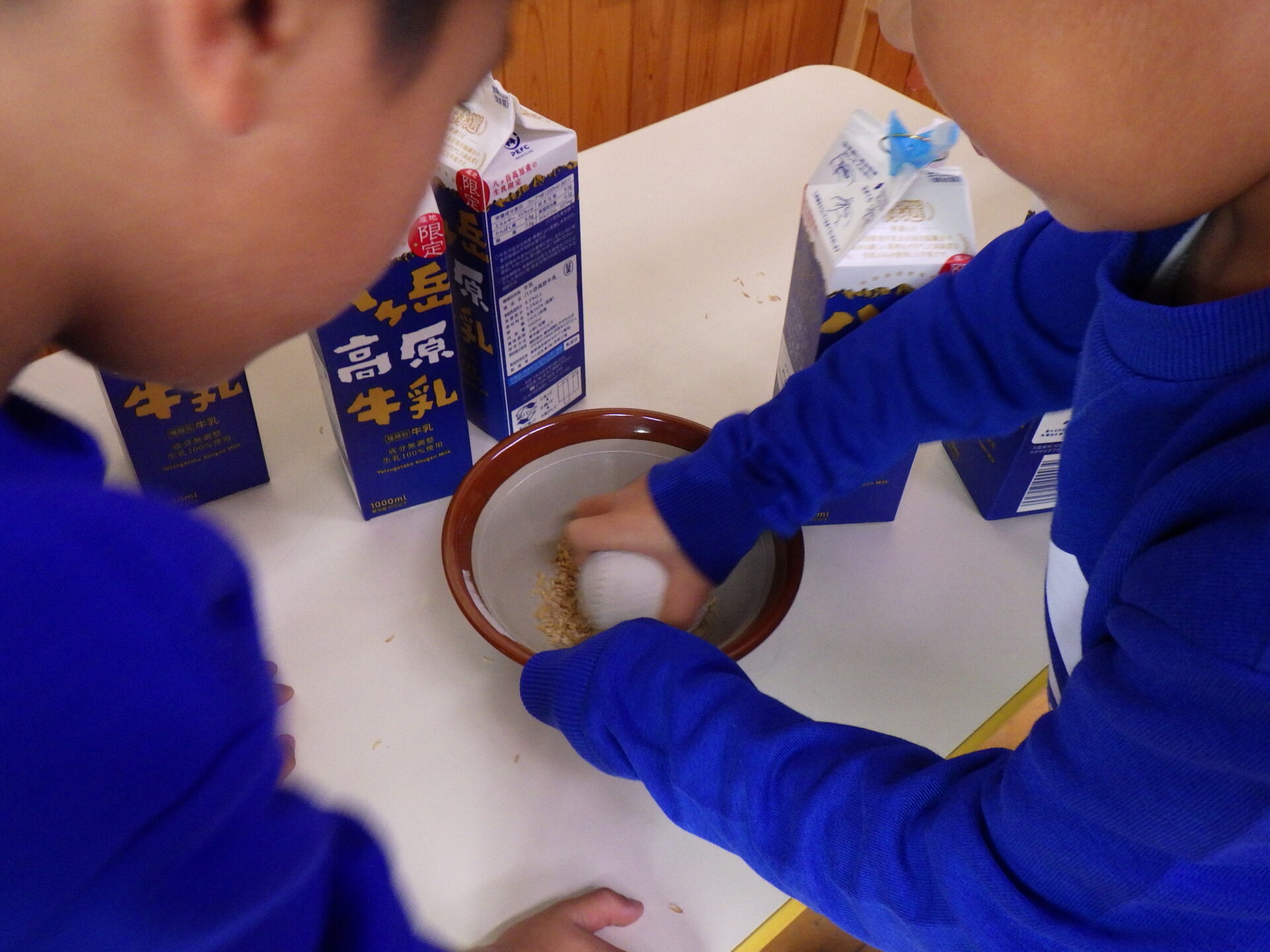 それからは、自分たちで力の入れ具合や、すり鉢に入れるもみの量を考えながら、