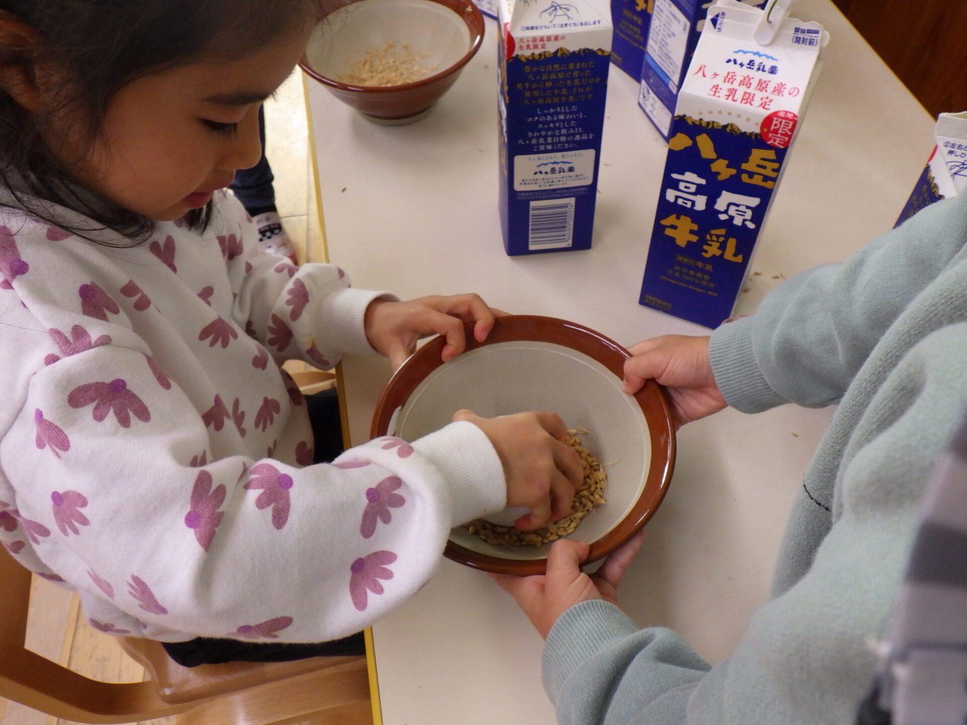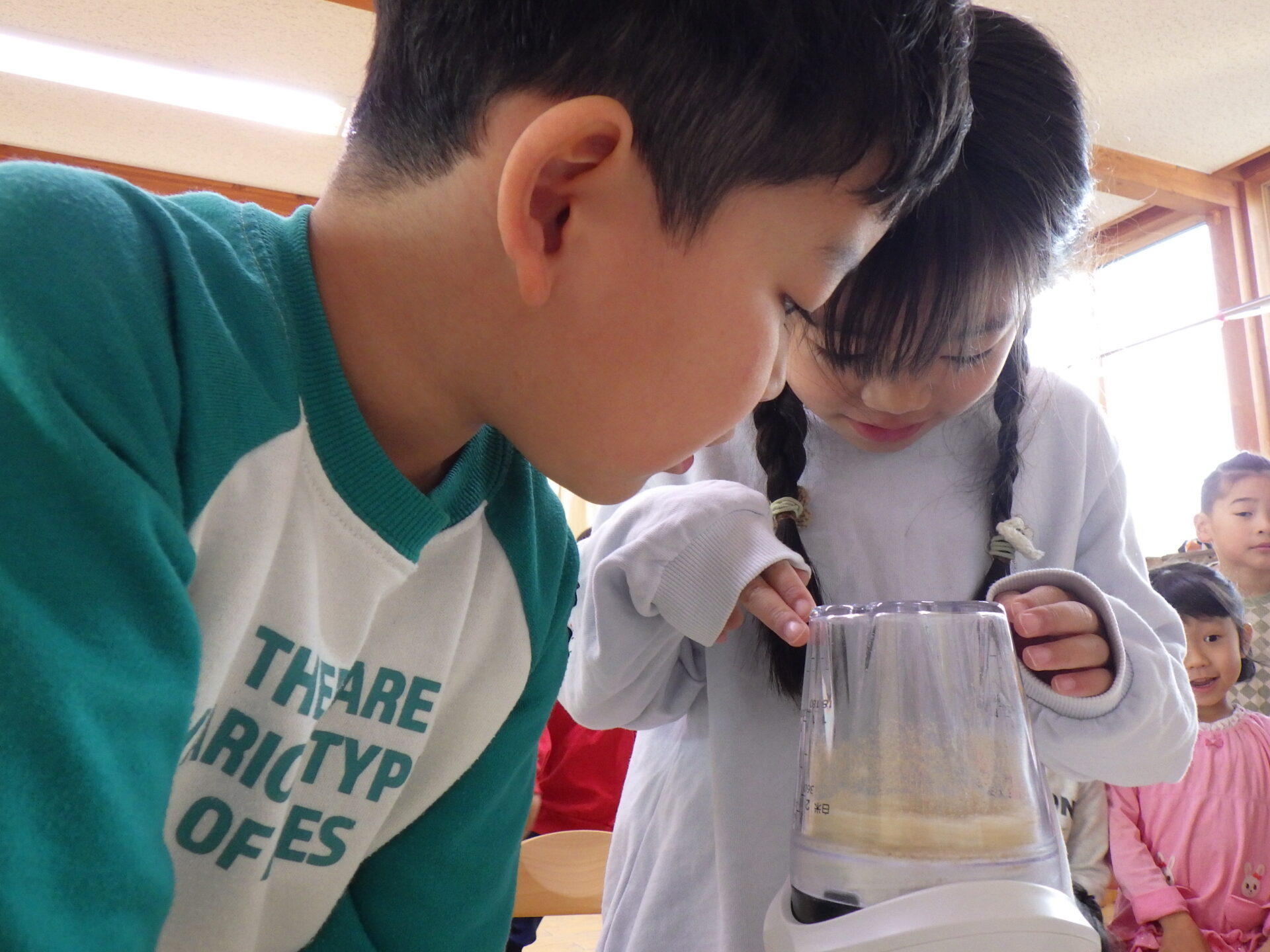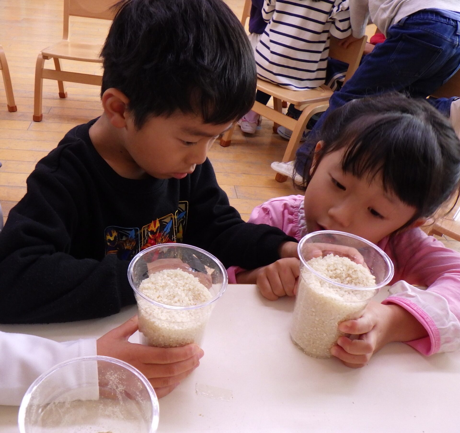 「見せて。あっ!白っぽいお米が出てきたよ!」