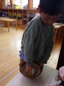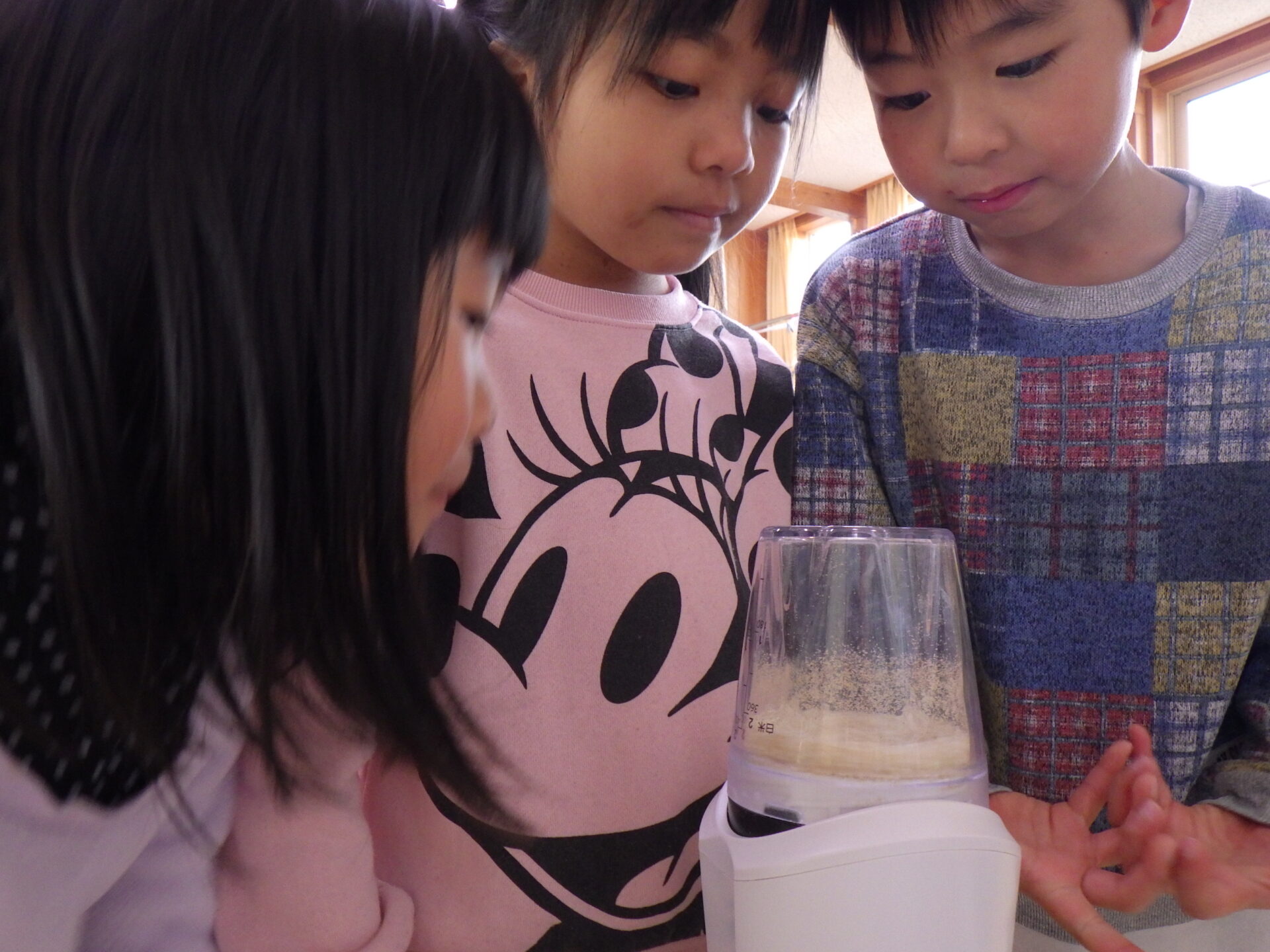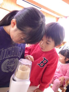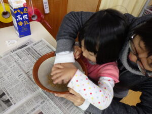 保護者の方は「すりばちとボールを使うのは知らなかったです。」「こうやってやるんですね。」と