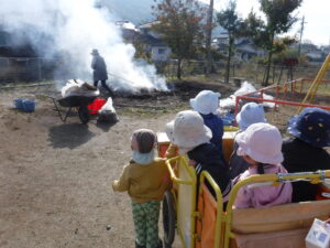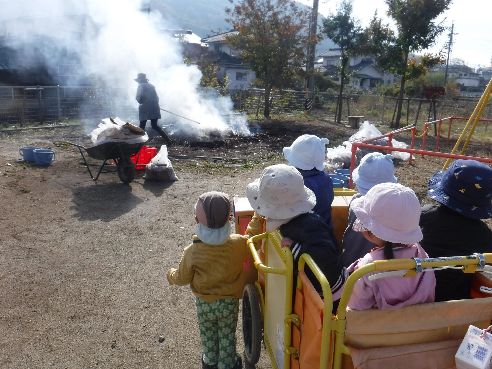 焼きいも会の日。0.1歳クラスは保育士がお芋をアルミホイルに包み、たき火にお芋を入れて焼くところを見にいくと、たき木や落ち葉からモクモク煙があがっていました。