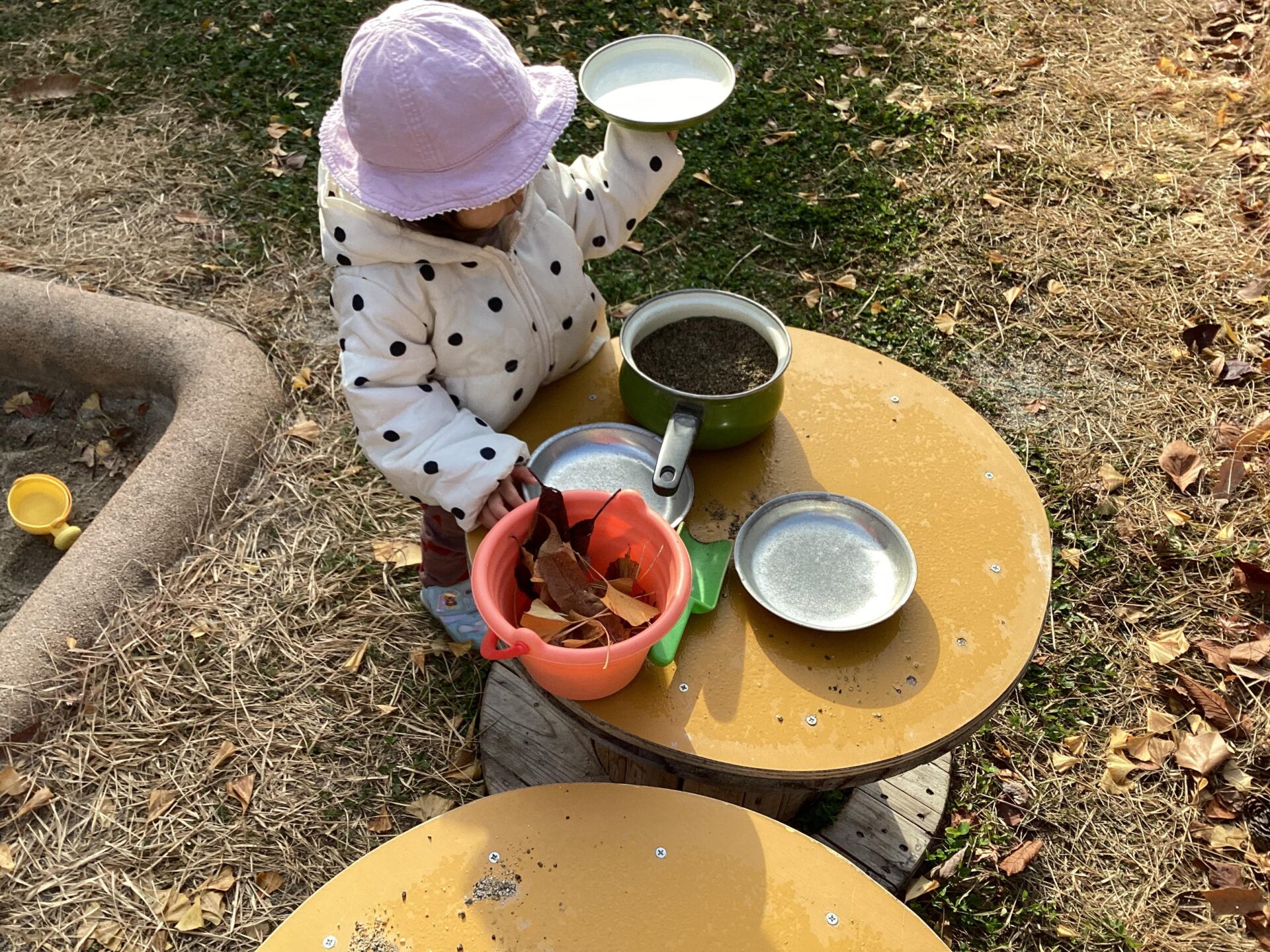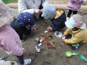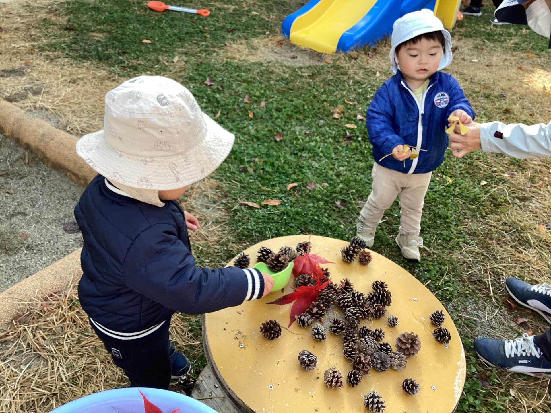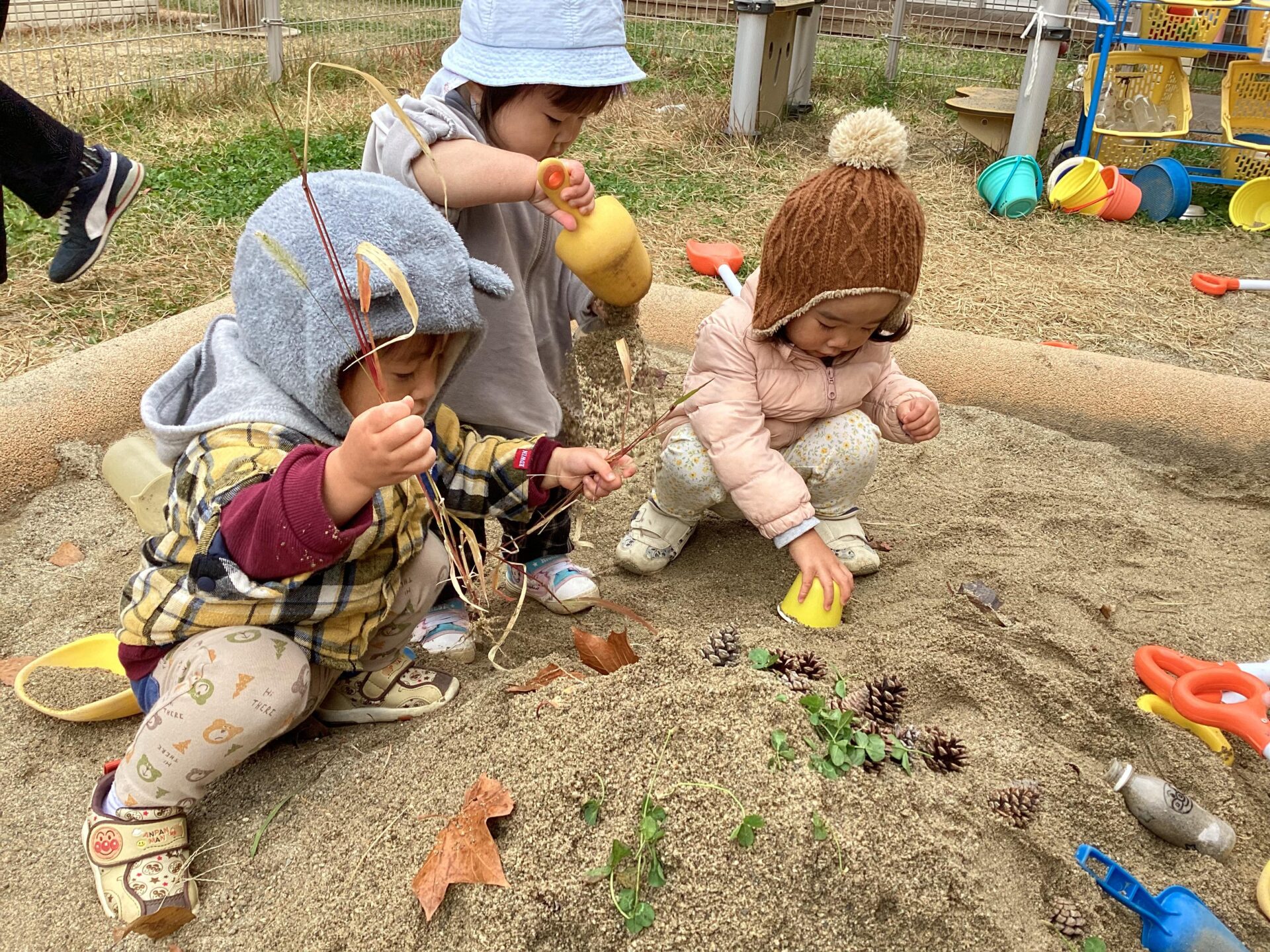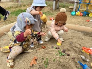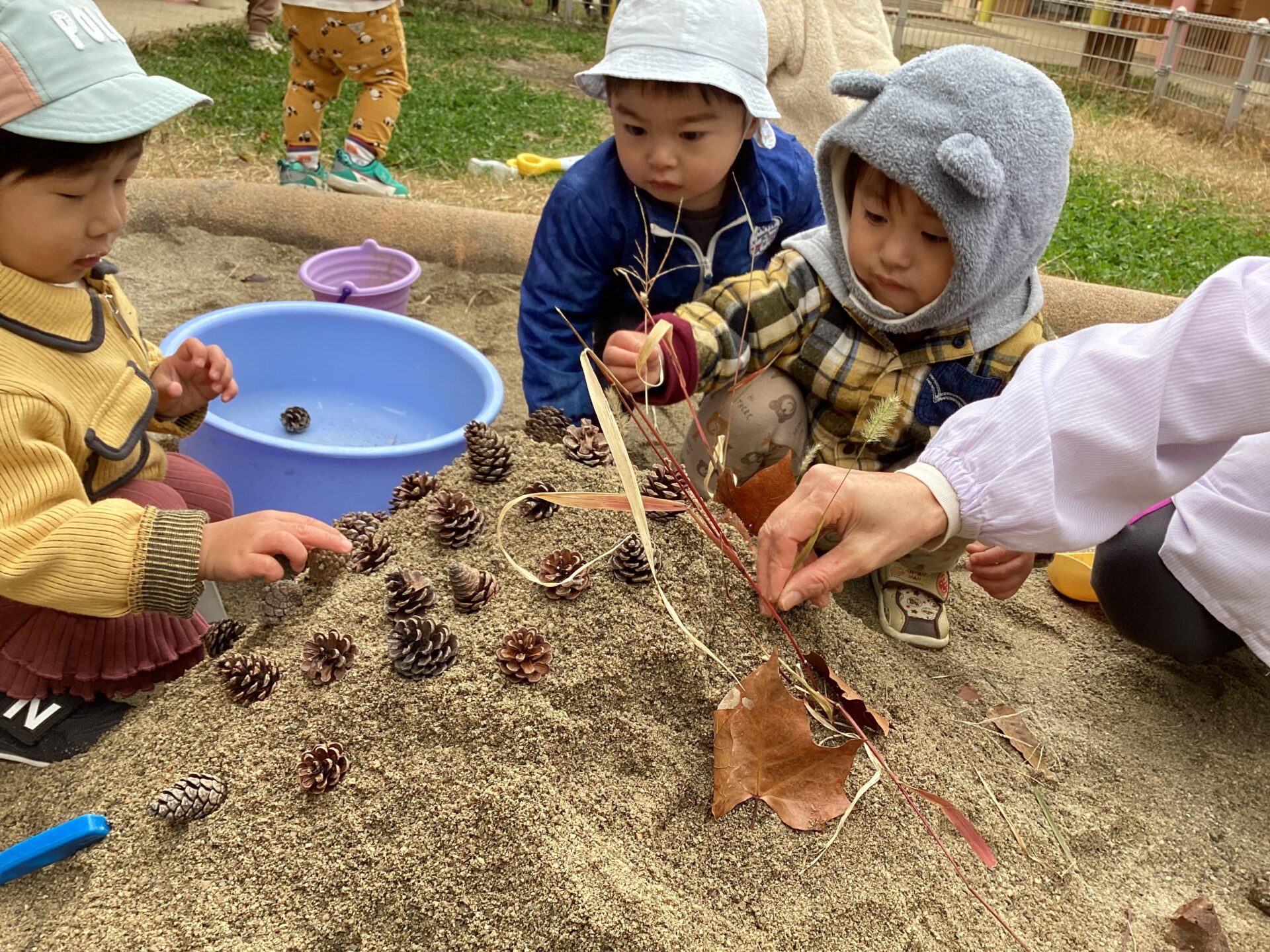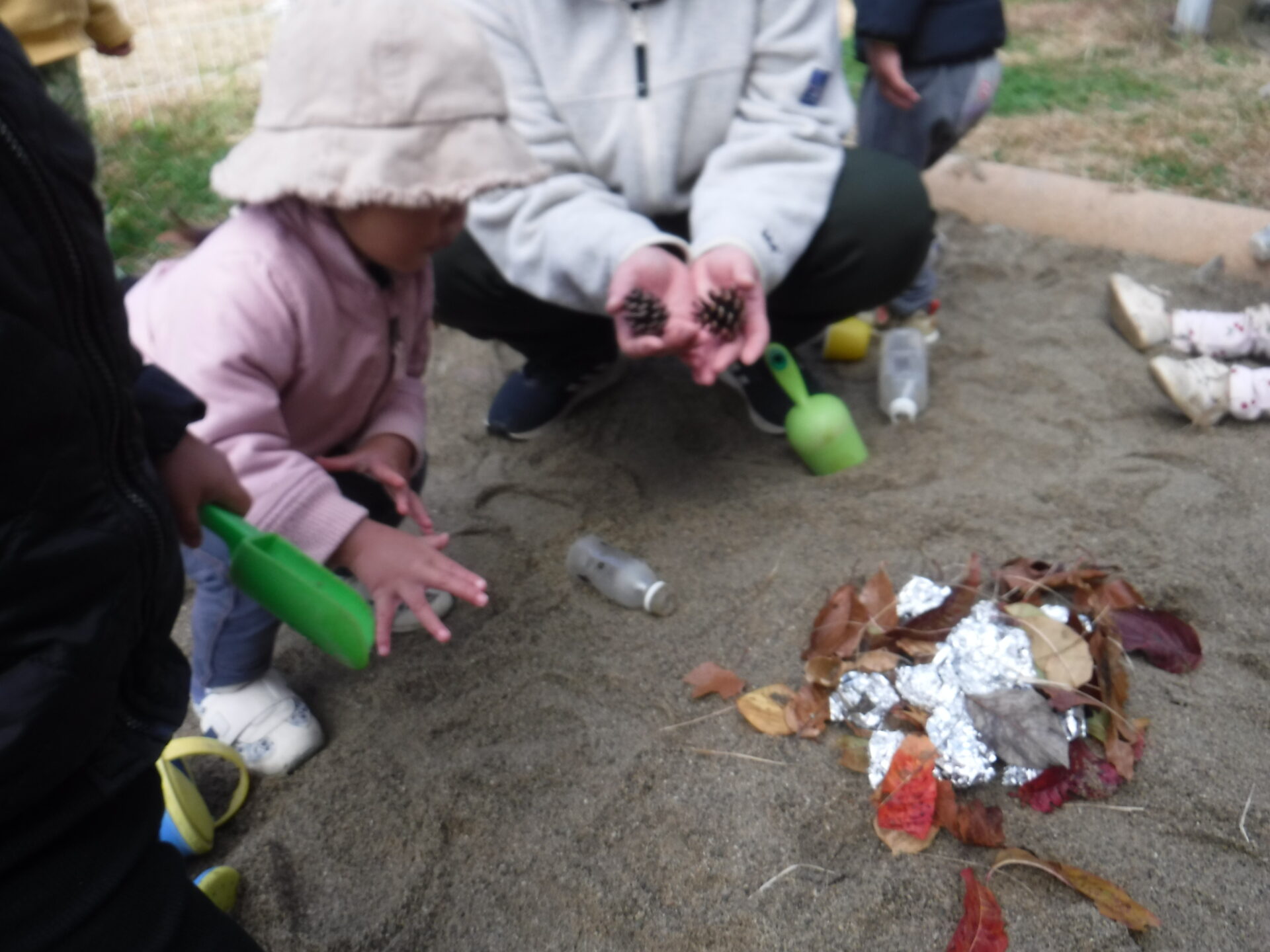 未満児の園庭に戻ると、見つけた松ぼっくりや落ち葉を使ってままごとや砂遊びを始めました。