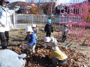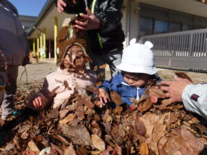 秋になると周りでいっぱい見つかる落ち葉。踏むとカサカサする音、フカフカの感触、中にもぐるとあったかい・・・空に舞うヒラヒラする光景・・・落ち葉を見て触れていろいろなことを感じていた子どもたち。一枚の葉っぱからも発見する喜びや楽しさをいっぱい感じて自然と触れ合うおもしろさや興味へとつながっていくといいなと思います。