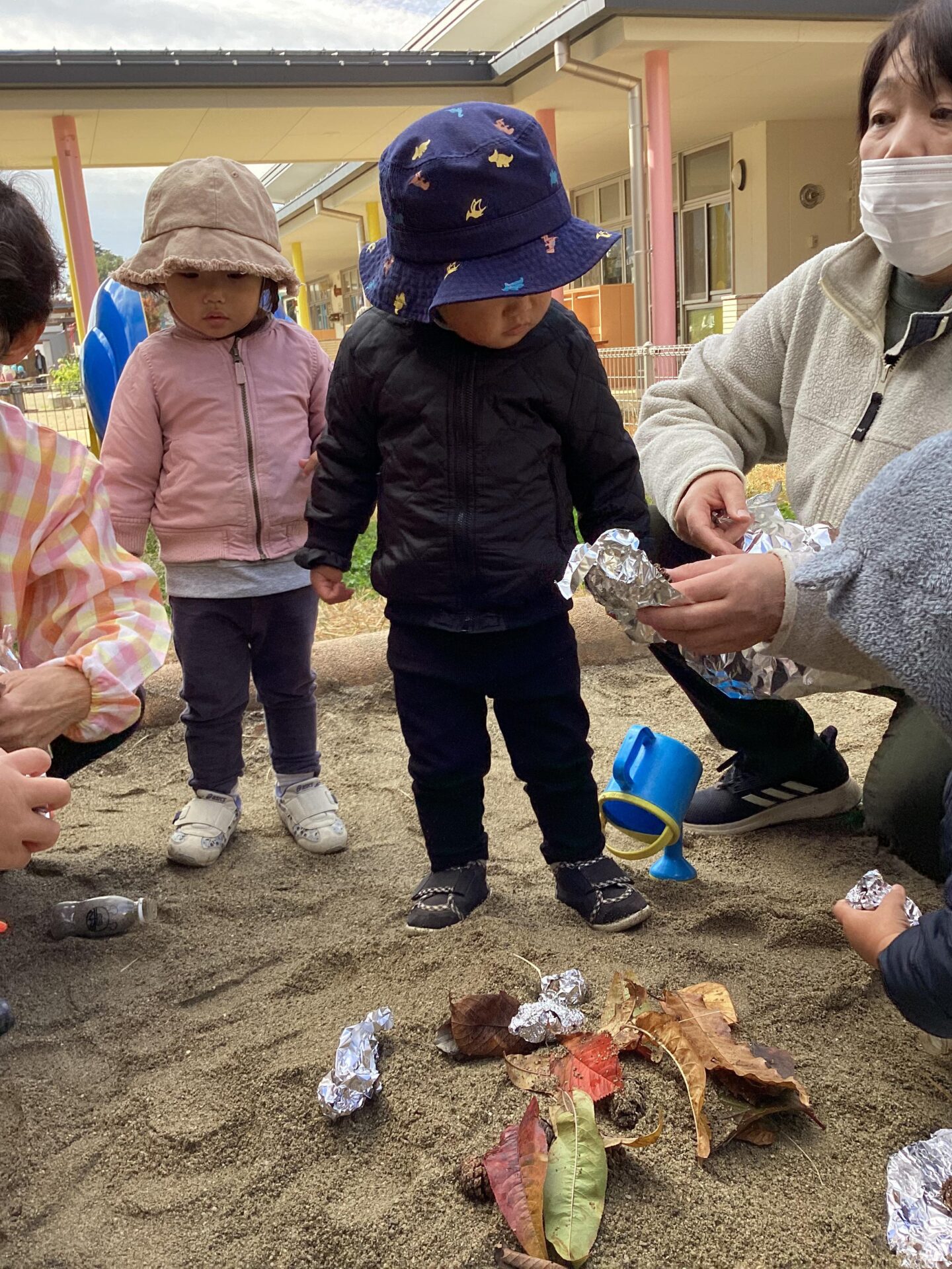 「みんなも焼きいも焼こう!」ということになりました。砂場にころがっていた松ぼっくり、保育士が持ってきたアルミホイル、子どもたちはそれをじーっと見つめ保育士が松ぼっくりをアルミホイルで包み始めると、子どもたちも同じように包み始め、見立て遊びが始まりました。