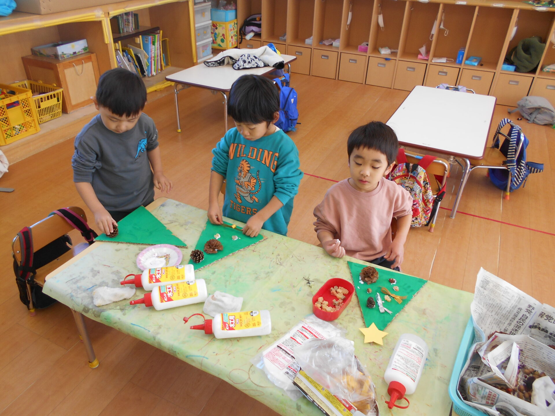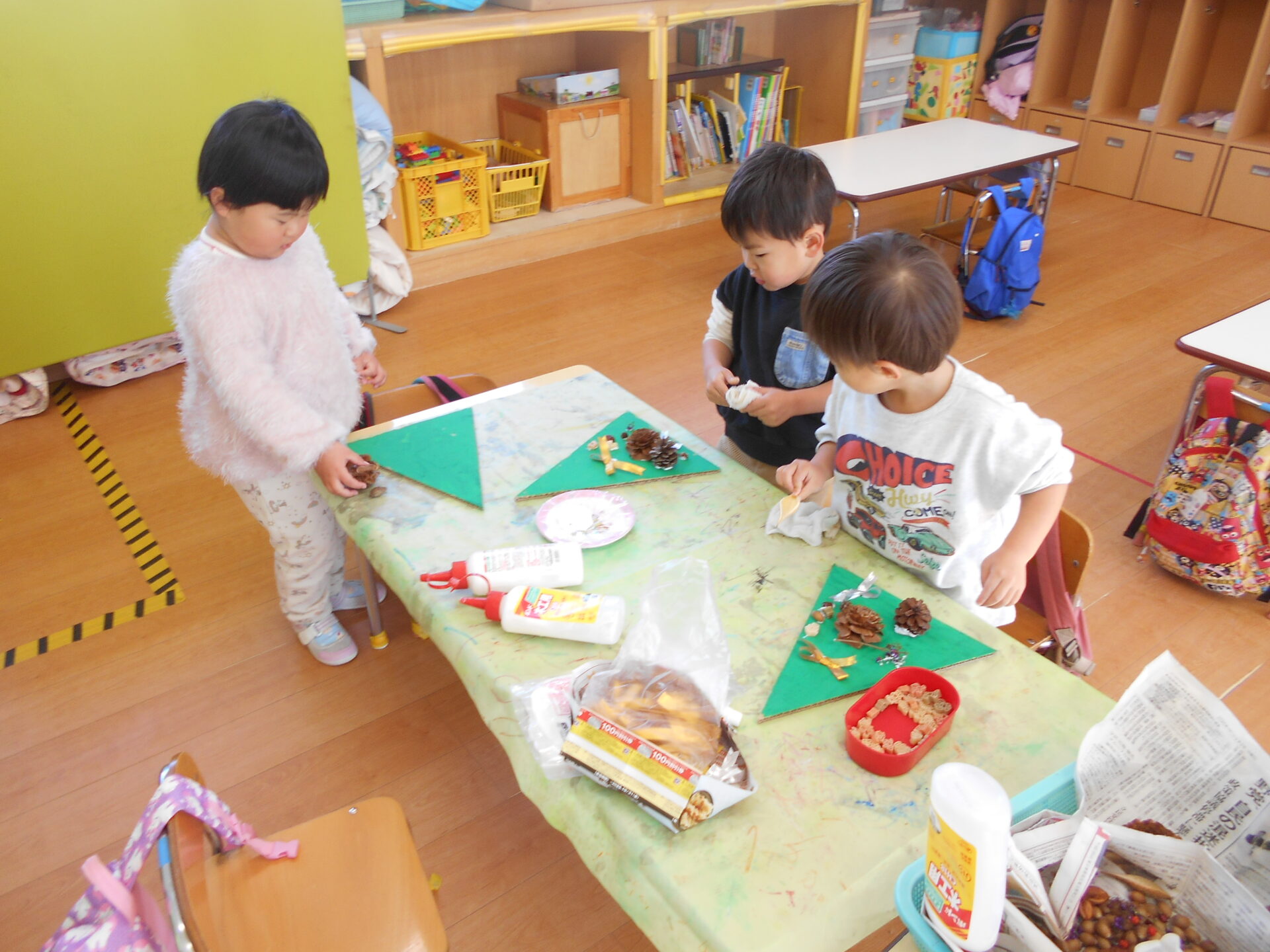 たくさん自然物が集まったのでクリスマスの飾り作りスタート☆