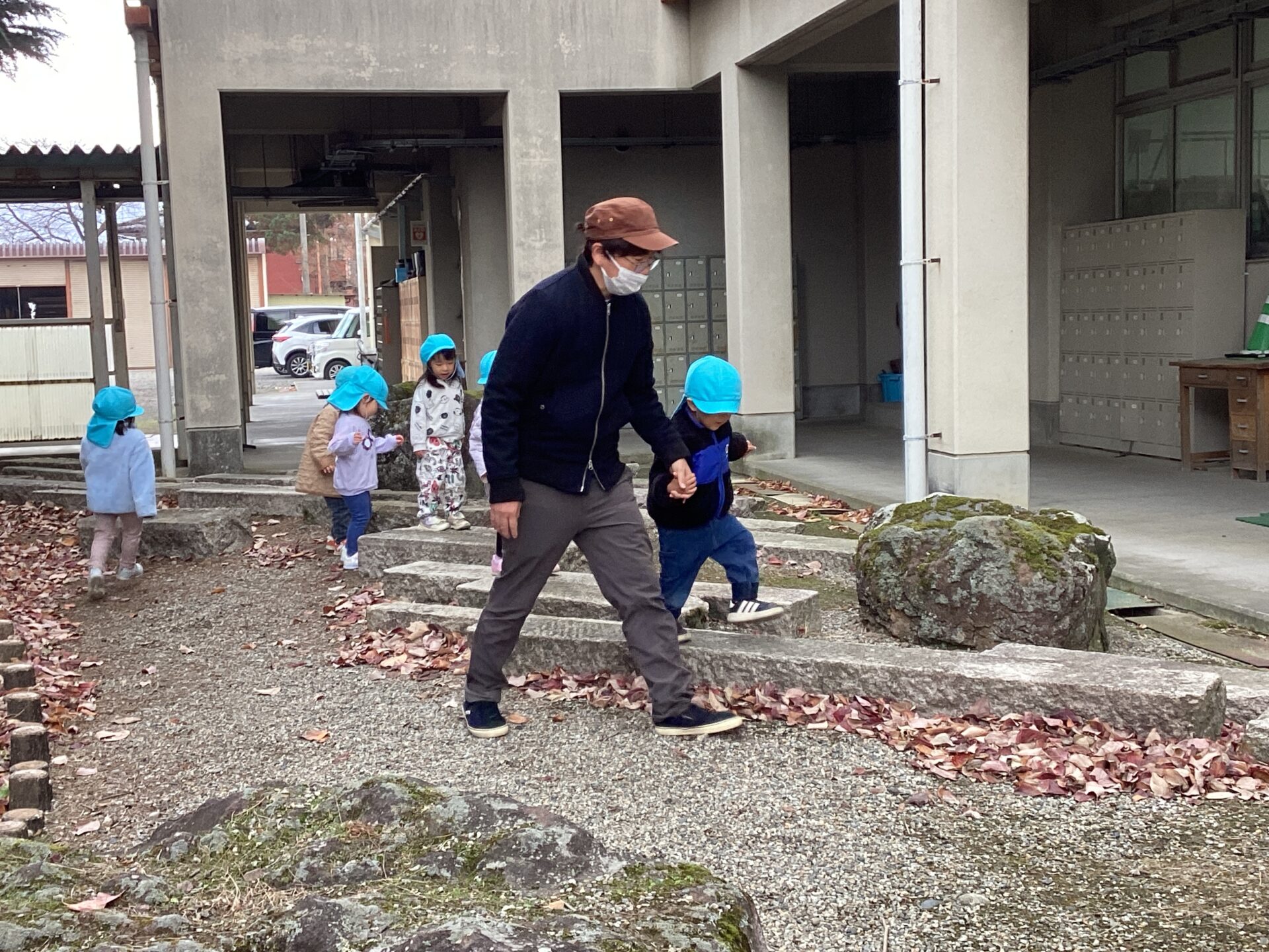 中庭では石渡りを楽しむ子ども達。