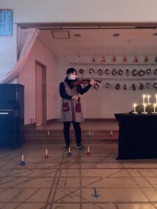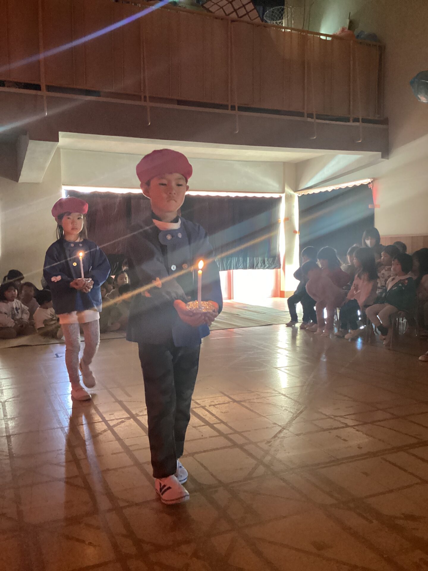 待ちに待ったクリスマス会、年長組のキャンドルサービスとっても綺麗だね!歌とベルの発表もしてくれました。バイオリンの演奏と合わさってとても綺麗な演奏でした。心が穏やかになりますね。