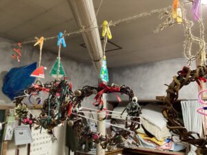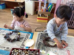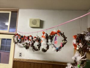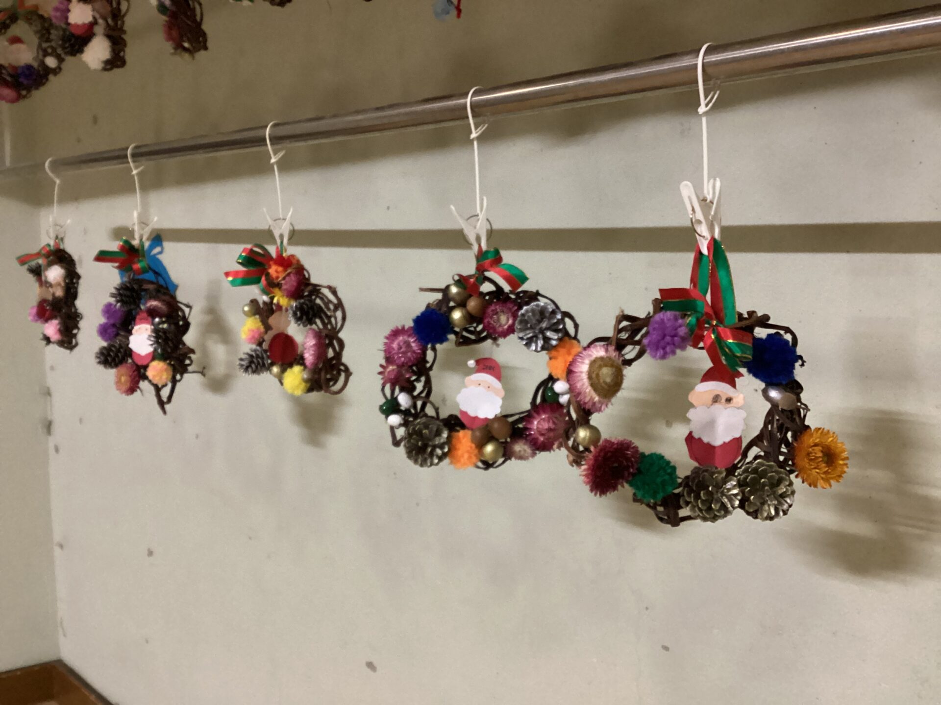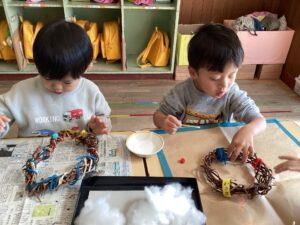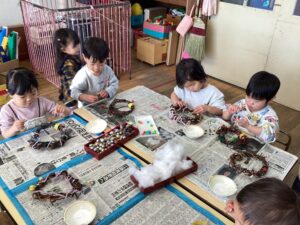 先日収穫したさつまいもから採れた蔓を使用してクリスマスリースを作りました。自分たちで拾ったどんぐりを使ったり、松ぼっくりやリボン、綿など様々な素材の中から自分で使いたい物を選んで製作を楽しみました。製作をしながら「サンタさんに何のプレゼント頼もうかな?」「サンタさんは靴下にプレゼントを入れるんだよ」とクリスマスに向けて子ども達なりに楽しみにしている姿がありました。
