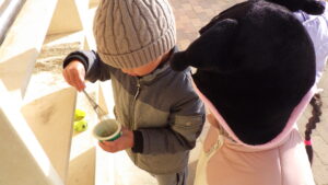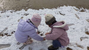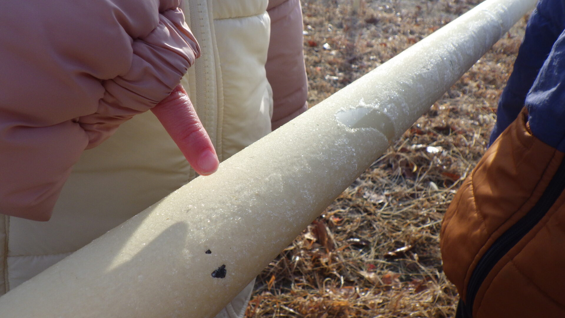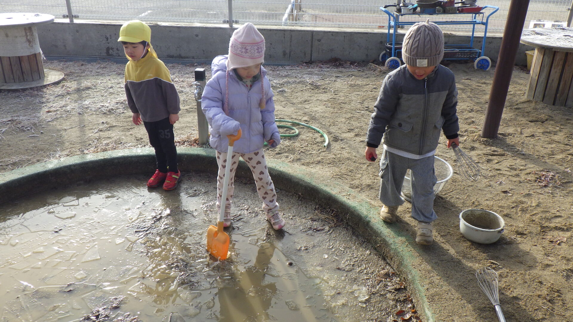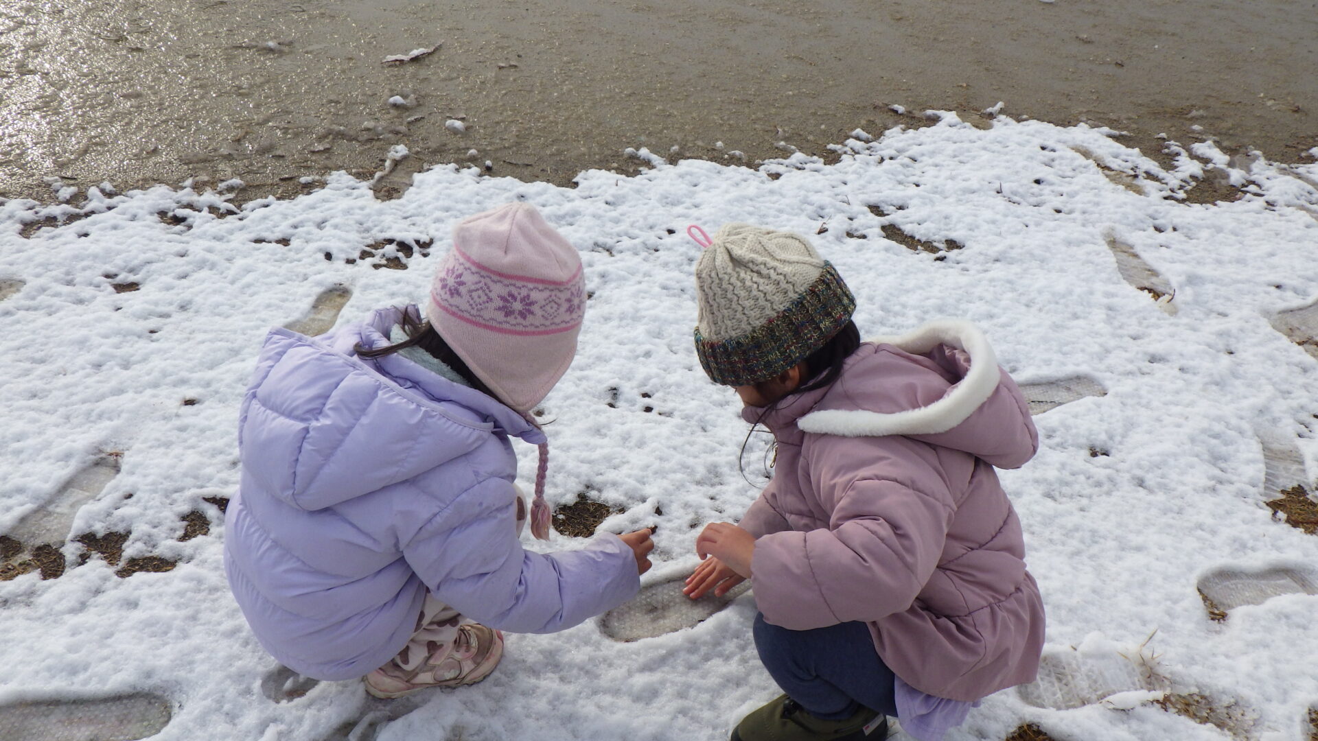 12月のある寒い日、子どもたちが遊具についている霜や水場で氷を見つけました。