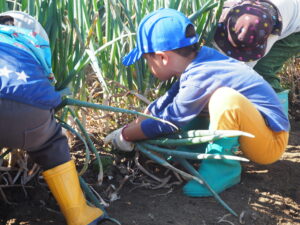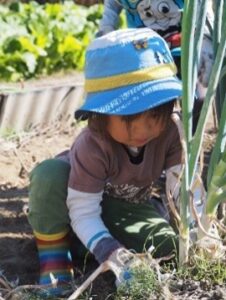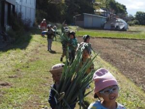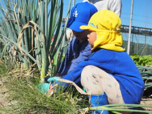 野菜や植物の根が、土から水や養分をもらうために生えていることは、子どもたちにとって、日々の自然との関わりの中ですでに知っている事でしたが、今回、ねぎの収穫を通して、根のもう一つの働きがあることを知ることができました。