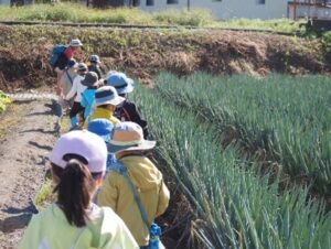 約1㎞の道のりを歩き、ねぎ畑に到着すると、「全部ねぎだ!」「こんなに生えてるの、初めて見た!」と驚く様子の子どもたち。