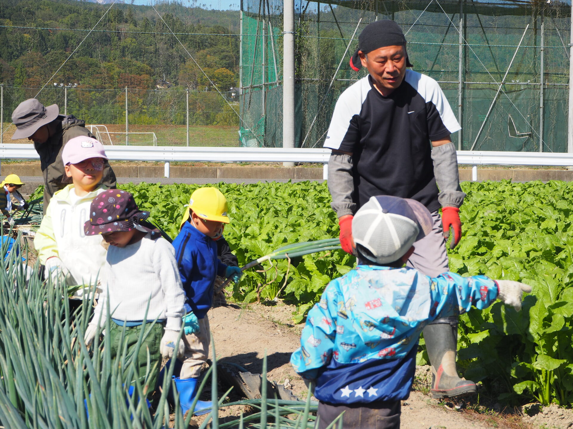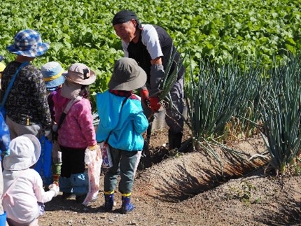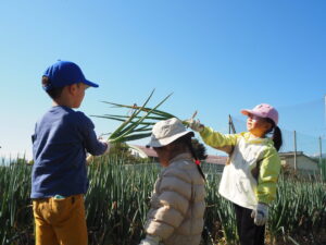 くじら雲の園庭にある畑でも、ねぎは育てていますが、これほどの規模のねぎ畑で収穫体験ができることはなかなかなかありません。今まで様々な野菜の見学や収穫をさせてくれた関さんに、子どもたちはとても親しみをもっており、散歩中に通りかかると「関さとるさん、こんにちは!」と元気に挨拶をしています。こうして、地域の方とかかわりをもち、園や家庭以外の環境で子どもたちの社会性や感性が育つ場が増えることは、とてもありがたいことだと感じています。