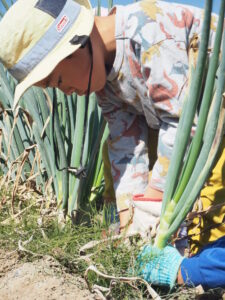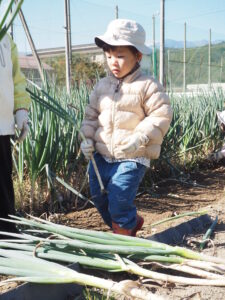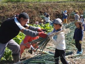 また収穫体験を通して、野菜そのものだけでなく、その畑の土の感触や匂い、加工される前の野菜の姿を見たり、感じたりすることができます。普段スーパーで売っているねぎとは違うからこそ、実際に抜いた瞬間の立派な根を見て「根っこの働き」の発見に繋がったのではないかと感じています。身近な野菜がどのように生長しているのか関心をもち、知ったことや考えたことを家庭に帰ってから保護者と話し、自分で抜いたねぎを味わってほしいと思います。
