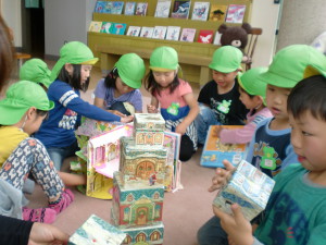 童話館の中です。絵本がいっぱい!!飛び出す絵本に子ども達も夢中。