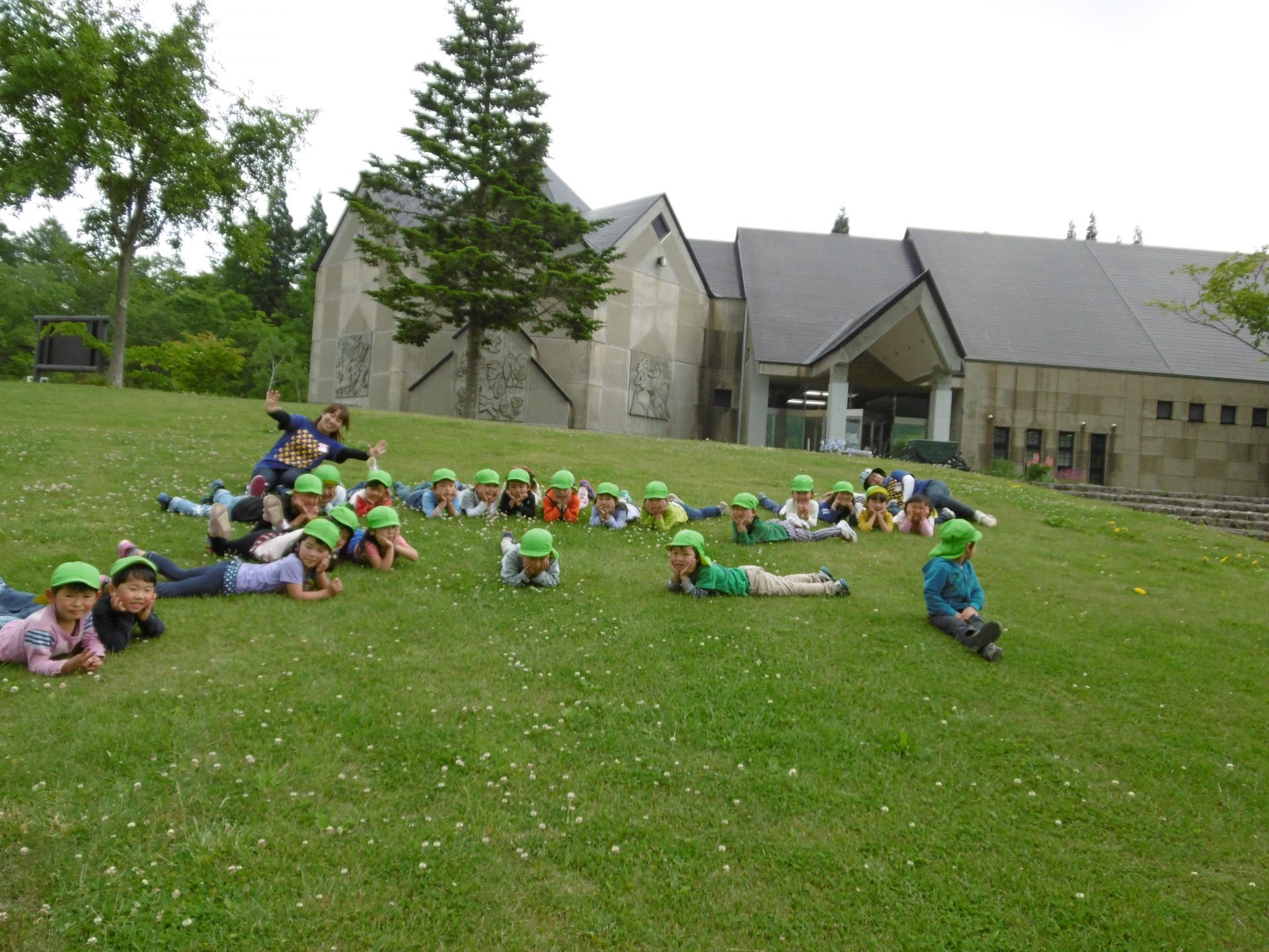 食後の楽しみは童話館前に広がる芝生に寝転がったり、他の保育園のお友達と走り回ったりして遊びました。お友達もでき、開放感を味わいました。