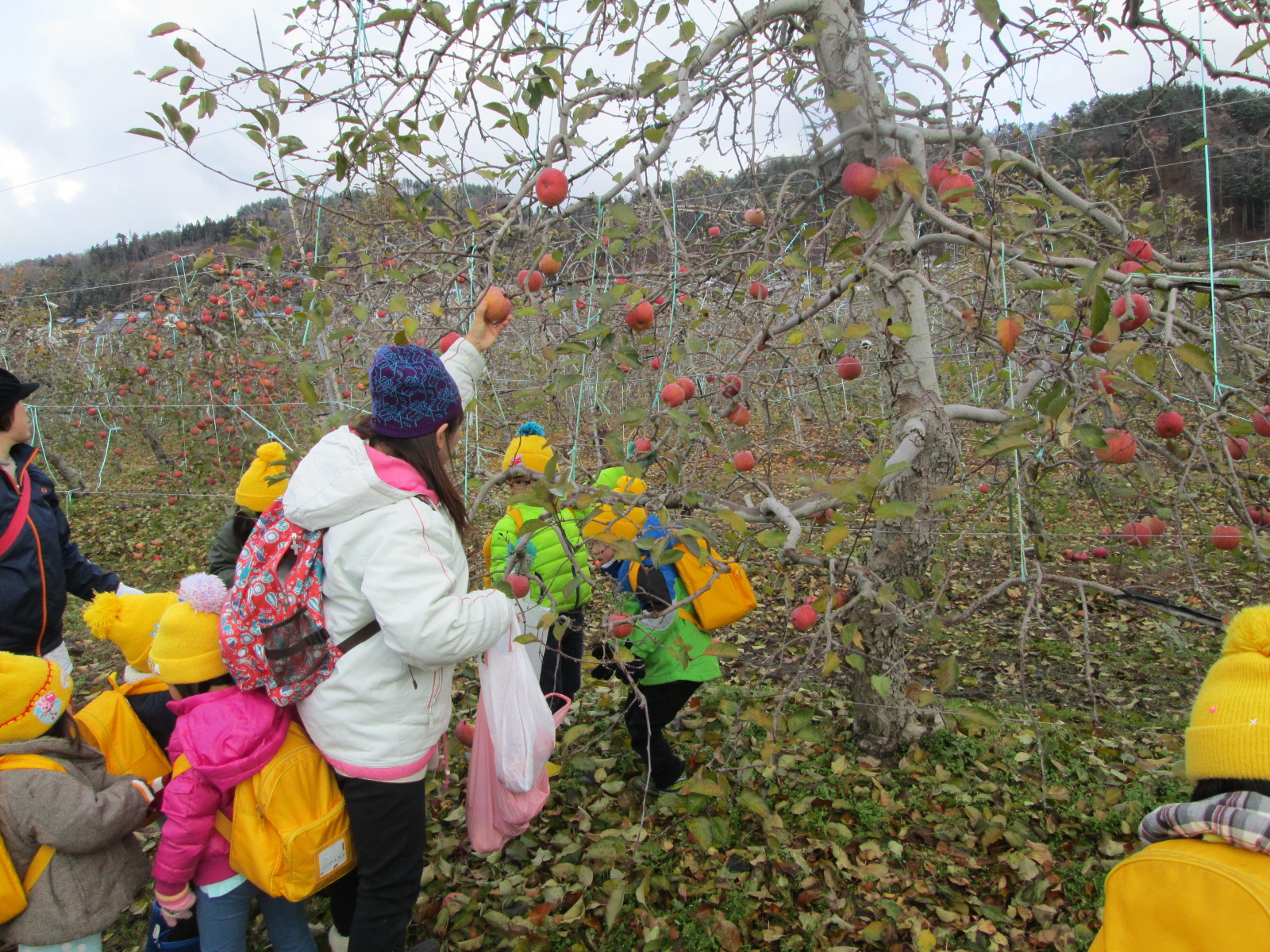 「木が高くて手が届かないよ。先生とって!」