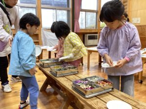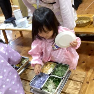 サシェを作る工程で、自分の好きな飾りを選んだり、好きな色、香り等、自分好みに選択できることが子ども達の興味、関心が高まったと思います。また飾り方も、子ども達の個性がよく表れていました。ロウが固まるまでに待ち時間もありましたが、廊下を動物やどんぐりになりきってゴロゴロ転がったりジャンプして遊び、体を動かして遊べたことが良かったと思います。年少クラスにとっては、初めての経験でしたが、普段から制作が大好きなクラスなので、今回の活動もピッタリとはまり、全員が最後まで楽しめました。最後はインディゴツリーに飾りつけをして、この時期ならではの活動になったと思います。