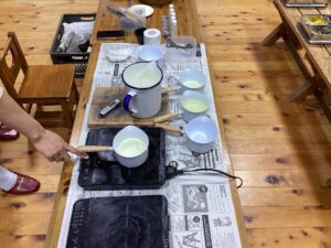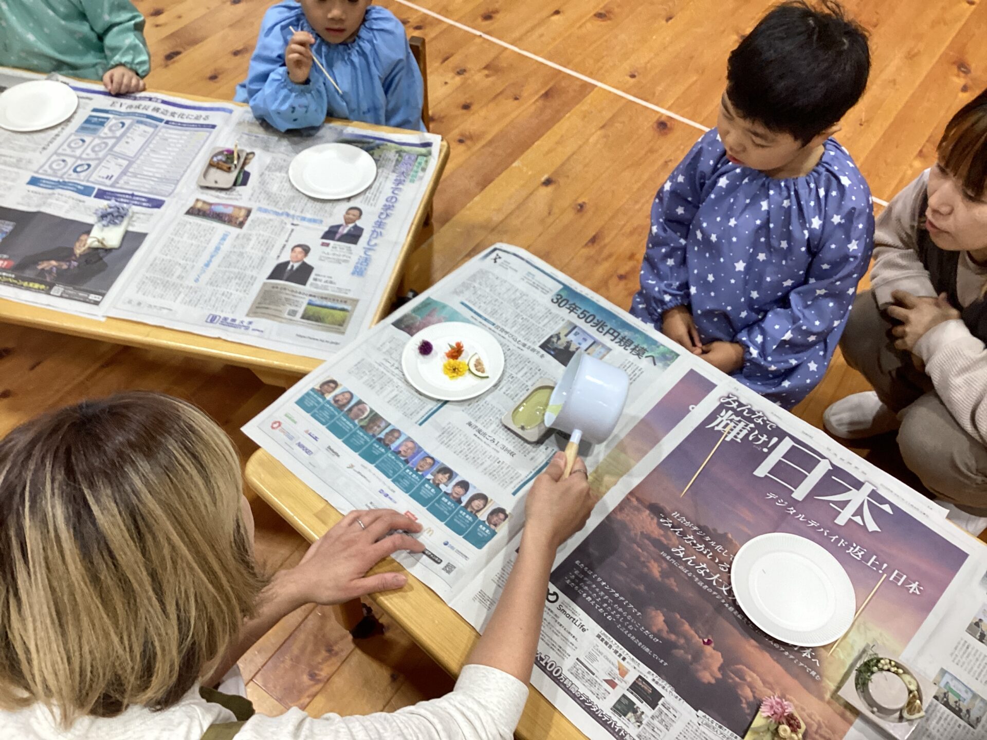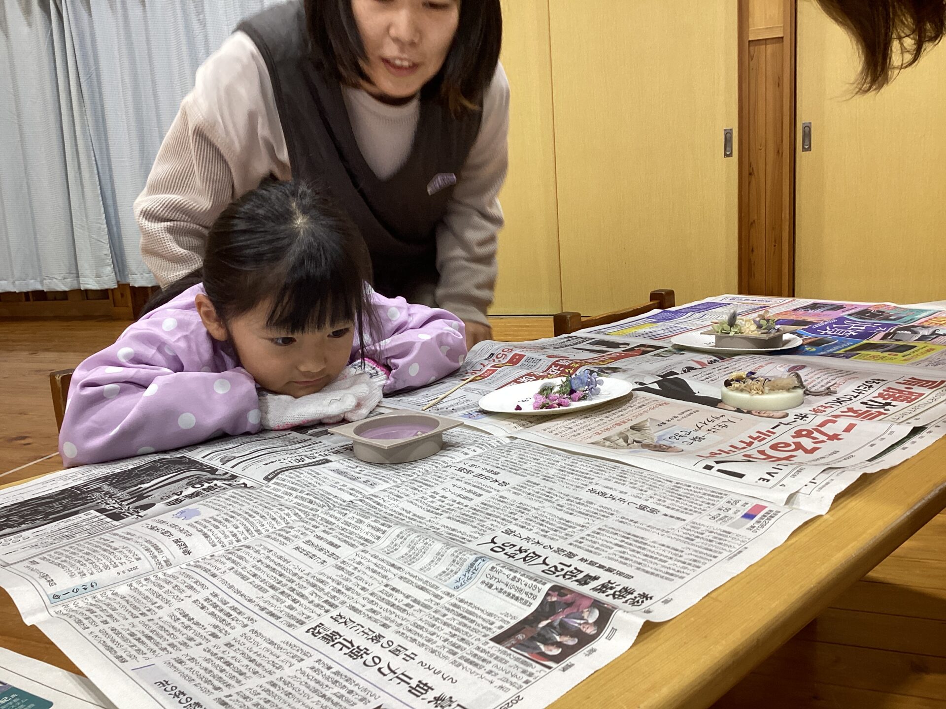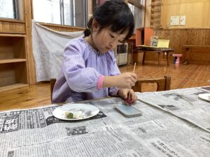 テラスに置いて5分程で固まり、固まったものをお遊戯室に持って行きます。