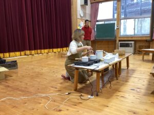 市村先生 「このあと、ロウソクの液を順番に流し入れて行きます。これはとても熱く、触ると火傷をしてしまいますので、気を付けてください。では、液を作るので、順番に前に来てください。まずは、黄色を選んだお友達、前へどうぞ。このお鍋や、コンロはとっても熱いので、触らずに一歩下がって見てみてください。」