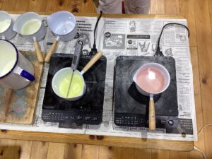 ・ロウソクに色や香りを付ける時は、一気に足すと濃い色になってしまうので、少しずつ入れること。