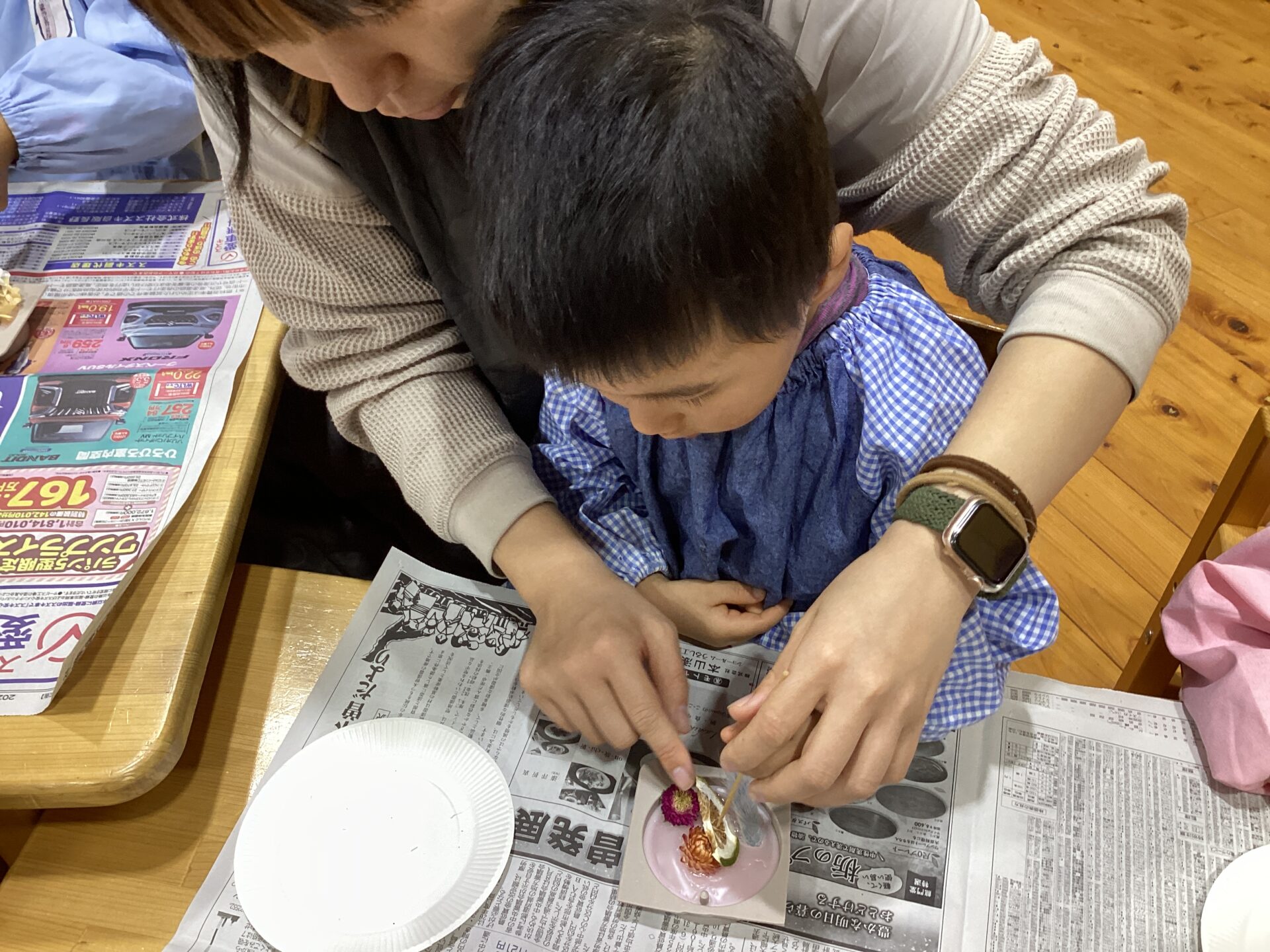 市村先生 「モヤモヤの模様が出てきた人は、選んだお花や草の飾りを載せて下さい。指で乗せて、竹串を使ってキュッキュッと押し込んでください。熱いので、指で直接触らないように気を付けて下さいね。」