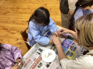 市村先生 「この粒を少しずつ足して、色を変えていきます。どうかな、色変わってきたの、わかるかな?一気に沢山入れると、すごく濃い色がついて戻せなくなってしまうので、すこーしずつ入れます。」