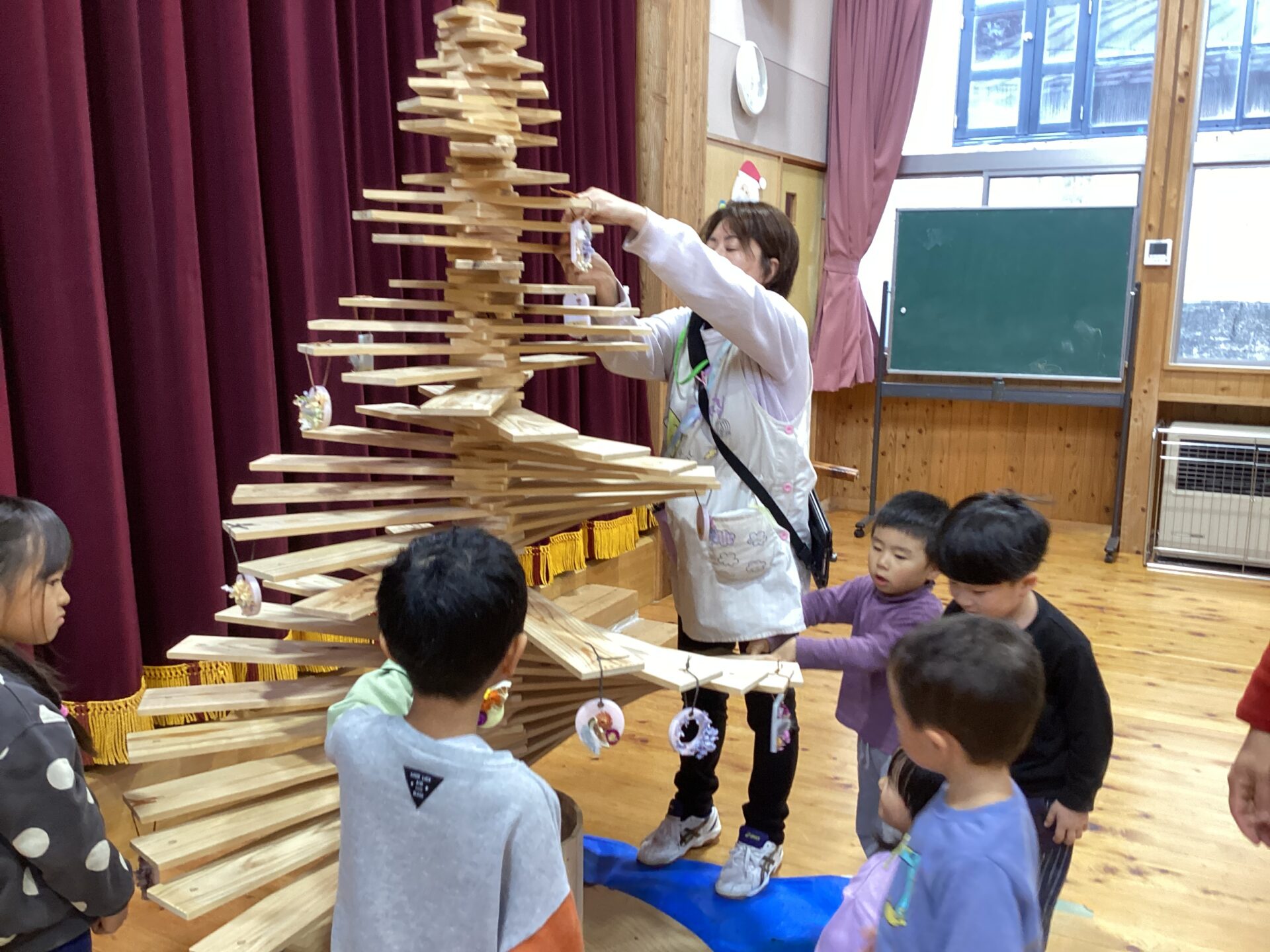 ツリーの板にサシェを結び付けて、おしゃれなツリーが完成すると、みんなで作品を一つ一つ見合い、お友達の作品を褒めたり、自分の作品を保育士にみてもらい、達成感や満足感で満たされている様子の子ども達でした!