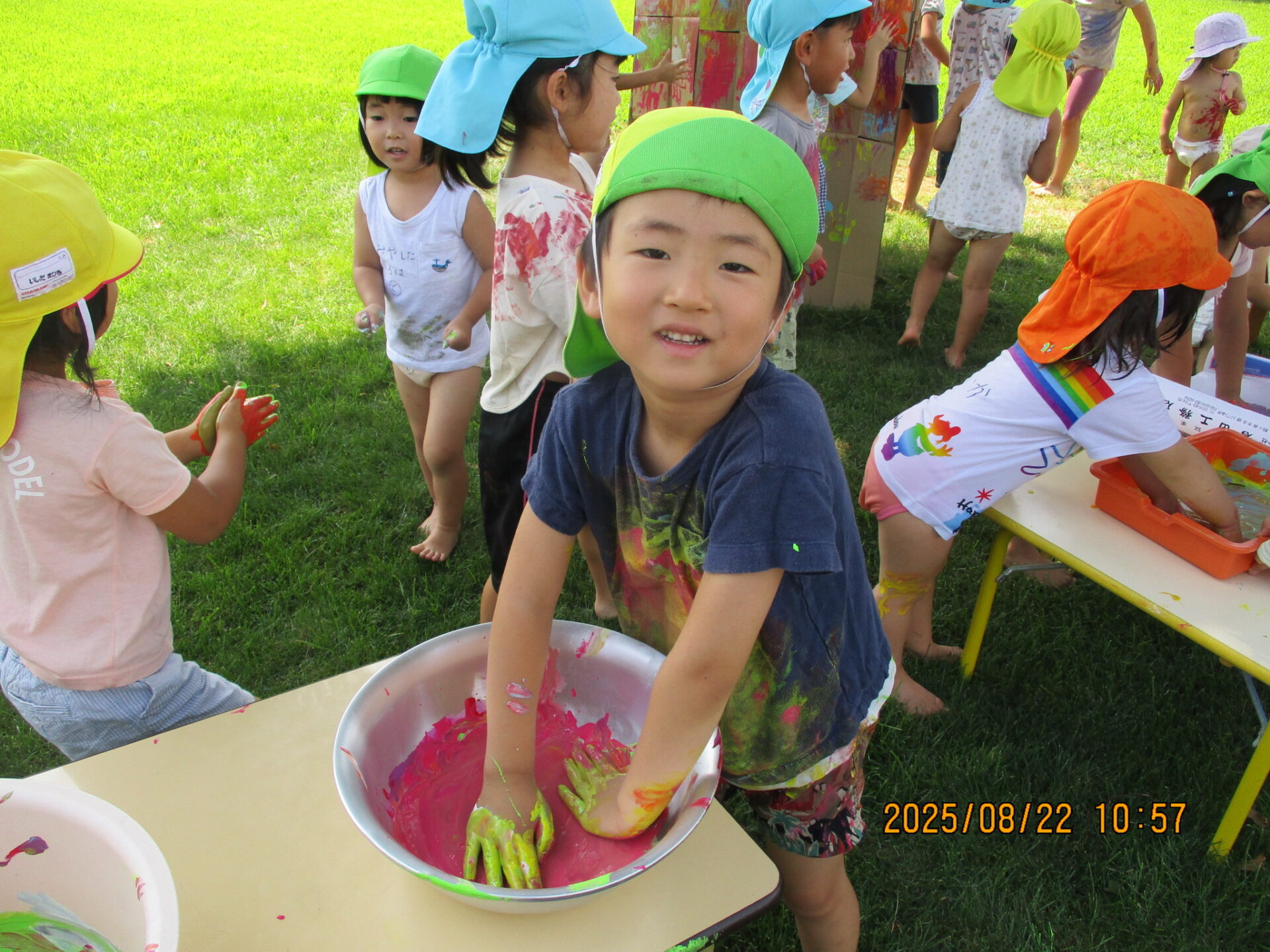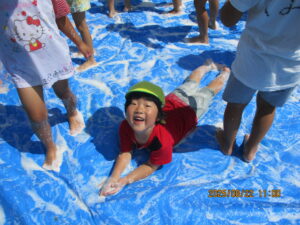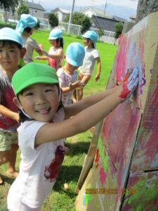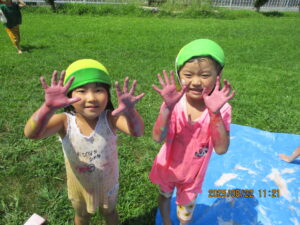 友だちと会話をしながら、絵の具を体に塗りあったり、おもいっきり体を動かしたりと友だち同士の関わりを楽しんでいました。プール遊びだけでなく「夏にはこんな遊びができるんだ!」と気づきができ良い経験になりました。