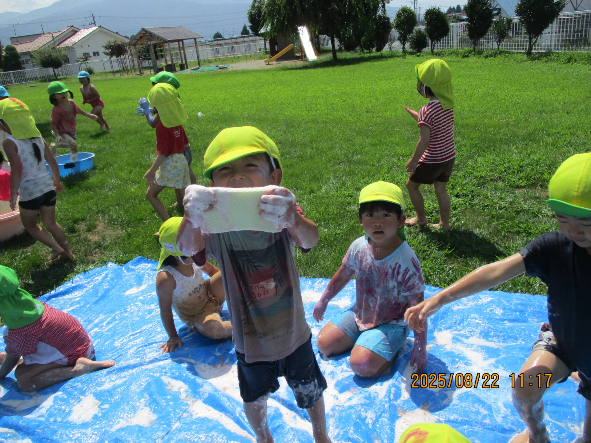 ・誕生日会のアトラクションで夏ならではの遊びができたらと思い取り入れました。このような活動が初めてだったので、子ども達も興味を示しており、絵の具の変化を楽しんだり、泡の感触を感じたりすることができました。