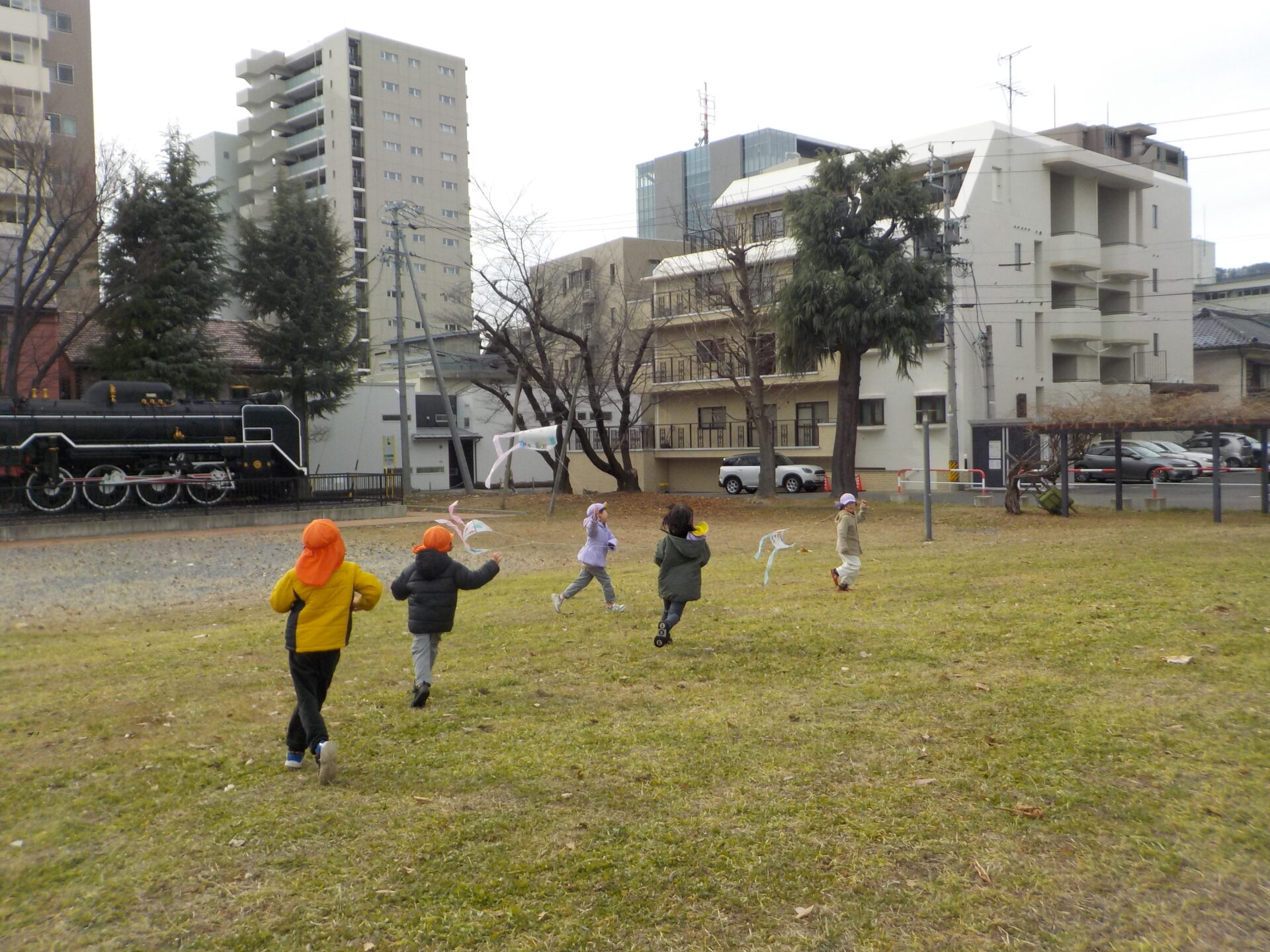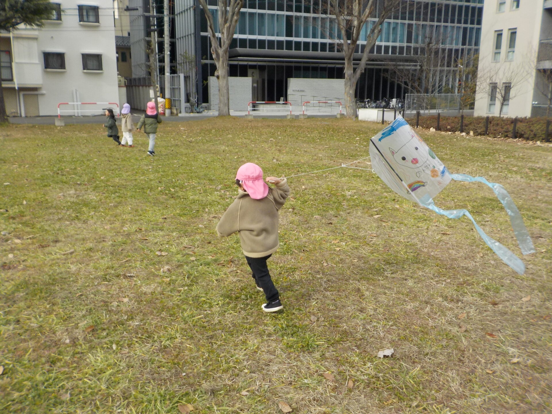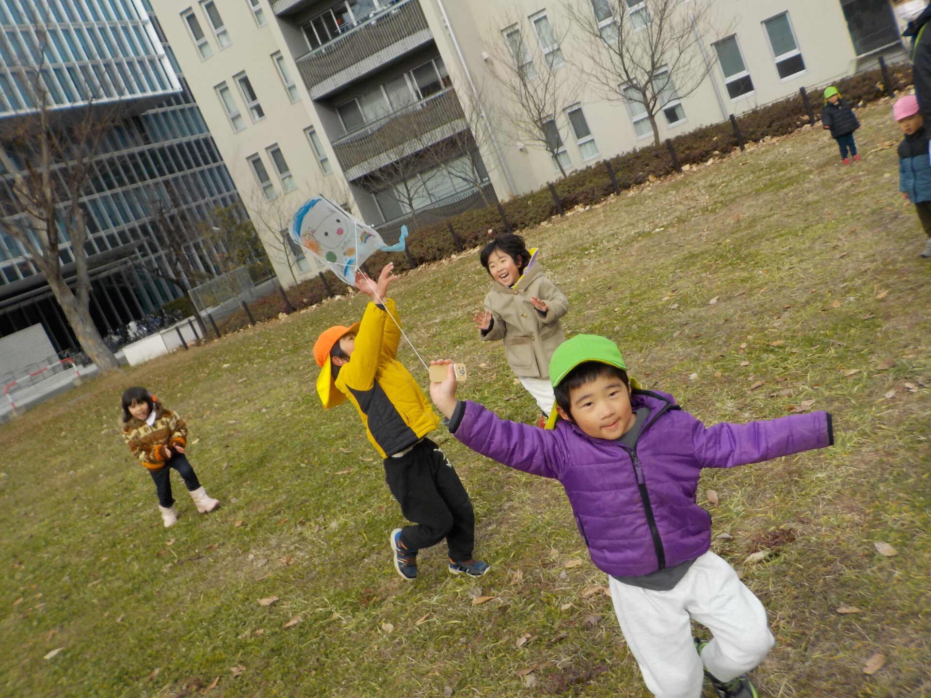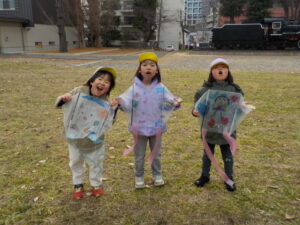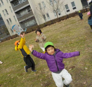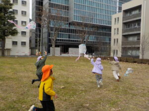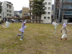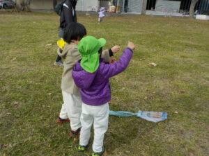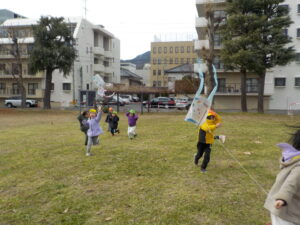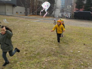 ・正月遊びのひとつとして伝統文化に楽しんで触れることができればという願いを持ち、凧作りをしました。「わたし〇〇描くんだ~」「早くあげてみたいね」とオリジナルの凧作りや実際にあげることを楽しみしていた年長児。日頃マラソンで出かけている広場で友達と一緒に思い切り走ったり、高く上がる凧に喜び何周も走っていた姿や、自然と異年齢児が集まり凧を追いかける姿は、興味関心がくすぐられ、遊びが広がっていくきっかけになっていたように感じました。広々とした戸外だからこそできる遊び、寒くなってきても楽しさから自然と体を動かせるような遊びを今後も楽しんでいきたいです。