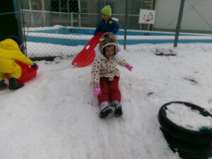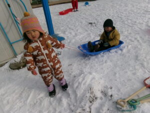雪が降り、今年初めての雪遊びに大興奮な子どもたち。