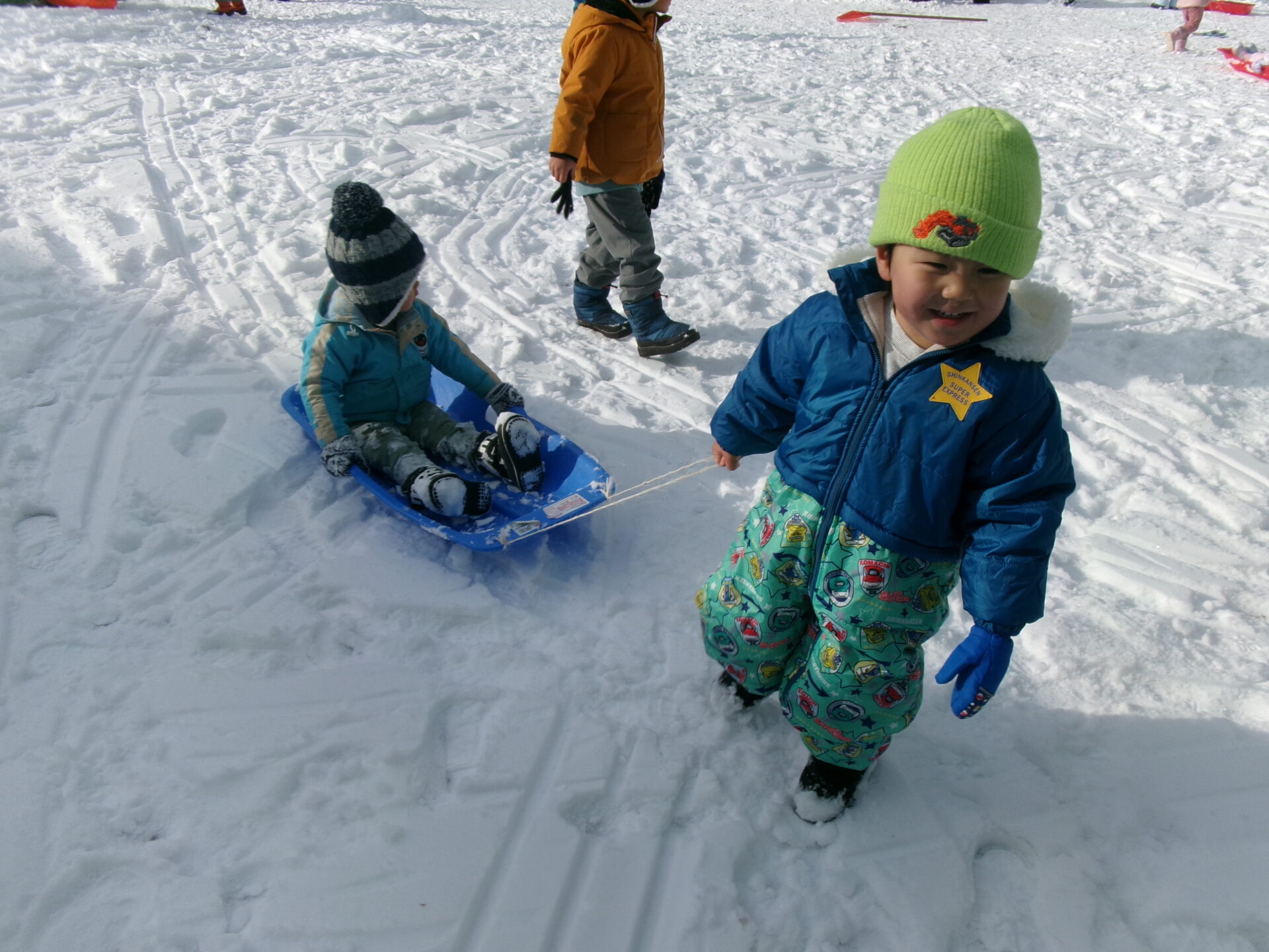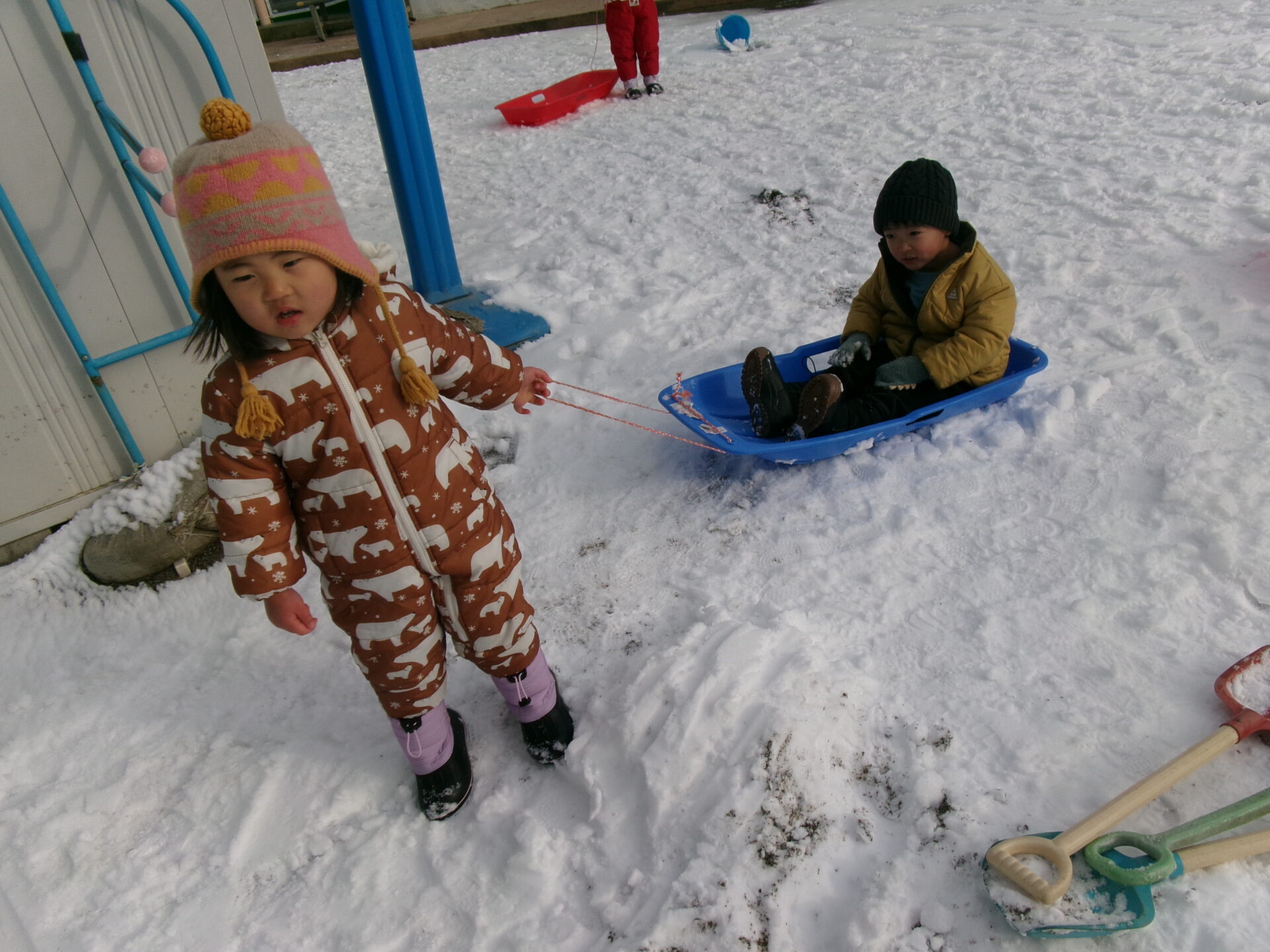 一人ではソリが動かないことに気付き、「だれかー!」と助けを求めたり「乗ってくださーい!」とお友達を呼んでいます。
