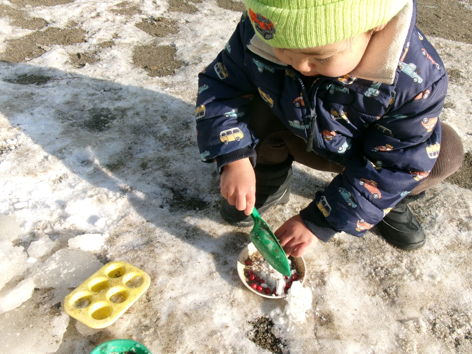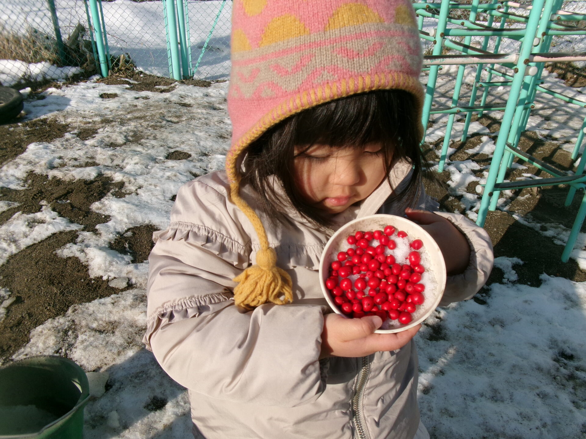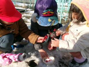 雪や氷、なんてん、砂など身の回りの見つけた自然物を使って見立て遊びを楽しんでいた子どもたちでした。