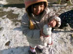 雪遊びの中で様々なことに気が付いたり、自然物を別の物に見立てて遊んでいた子どもたち。子どもたちなりの表現を認め、共感することでイメージが広がるようにしました。これからも身の回りの自然物を取り入れて遊びを広げていって欲しいと思います。