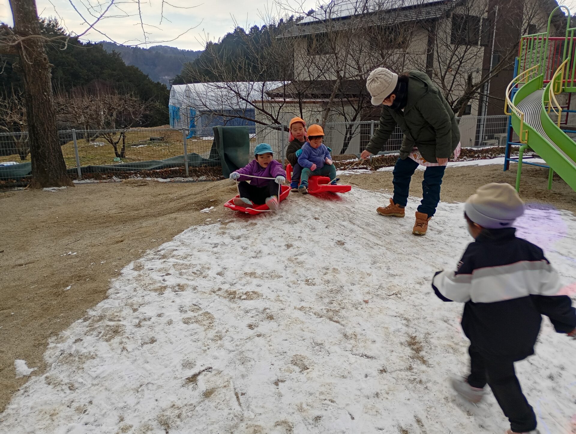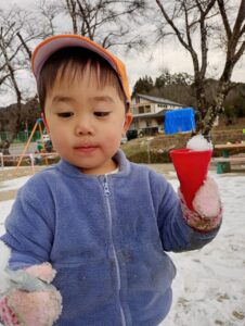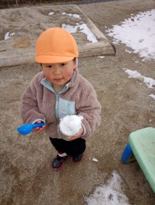 年齢の小さい子たちにとって、冬の遊びに夢中になる上で“寒すぎない”事も大切です。寒くて悲しい気持ちが残ると冬の戸外遊びに消極的になってしまうこともある事を十分配慮して、「面白かったね!」「またやろうね!」と言った気持ちが残ってくれるといいです。雪の季節は始まったばかり。もっともっと色んな事を経験できるといいな。