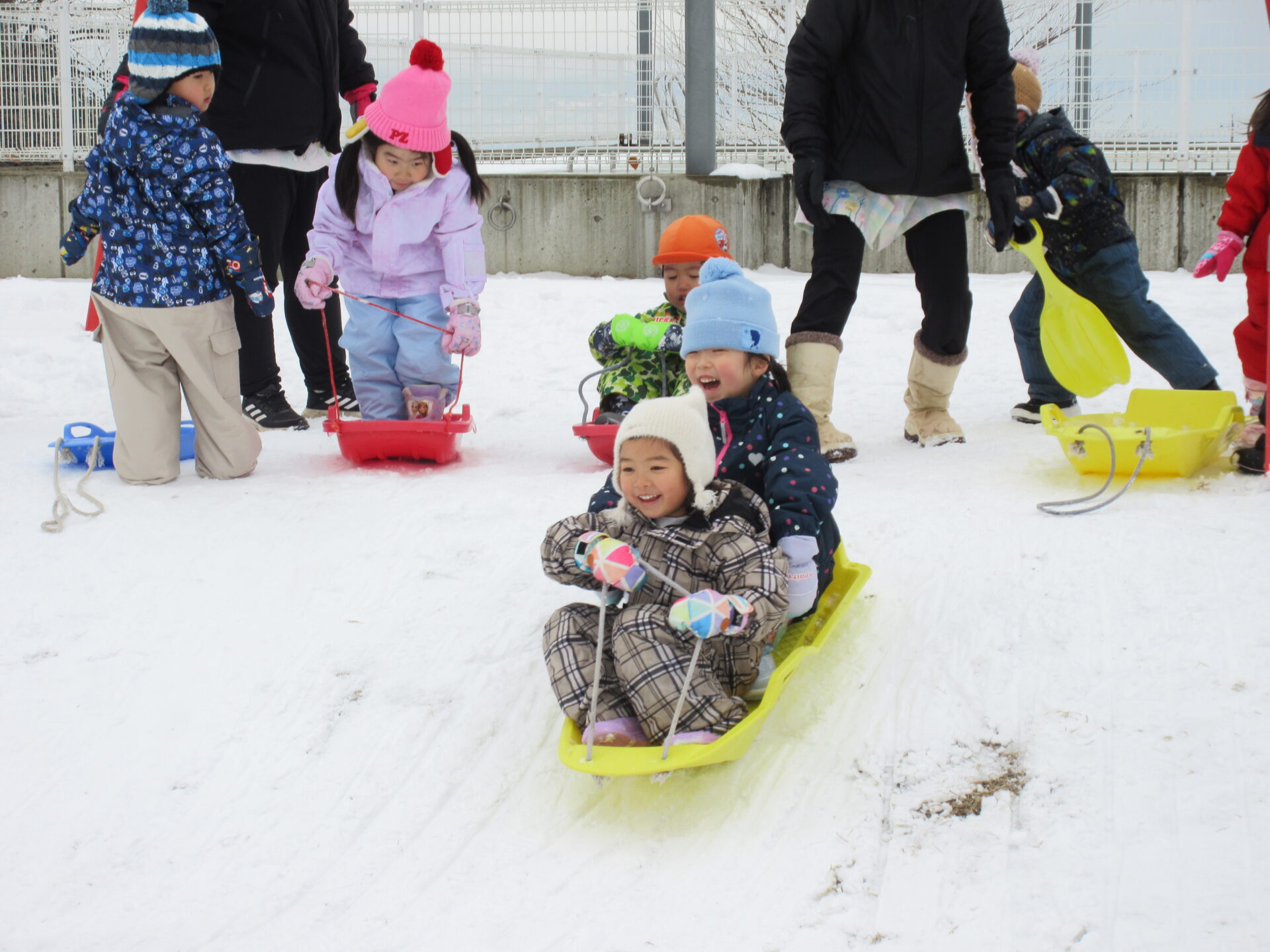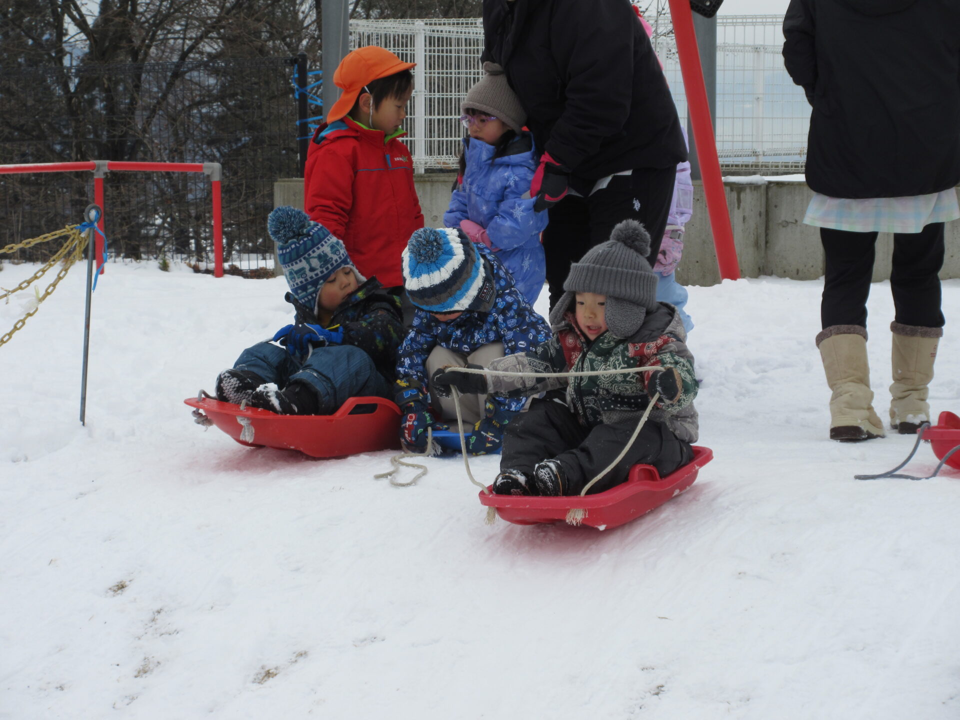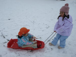 そりを二人乗りしている時にどうしてもひっくり返ってしまう子どもたちが、どうしたらひっくり返らないのか楽しそうに相談している声が聞こえてきました。