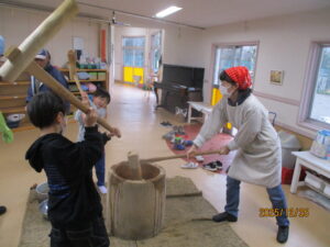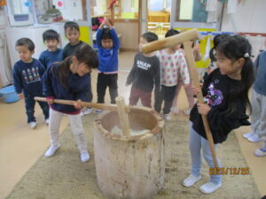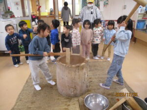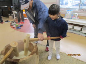 準備が整い、「さあ、いいぞ!誰からやる?」と栗林さん。昨年も経験している年長さんから順番に餅つきをしました。「よいしょ、よいしょ」かけ声に合わせてみんなで頑張りました。杵の持ち方や、次の人と交代するときに臼の周りに敷いてある筵に杵の先が付かないようにすることなど教えてもらいました。
