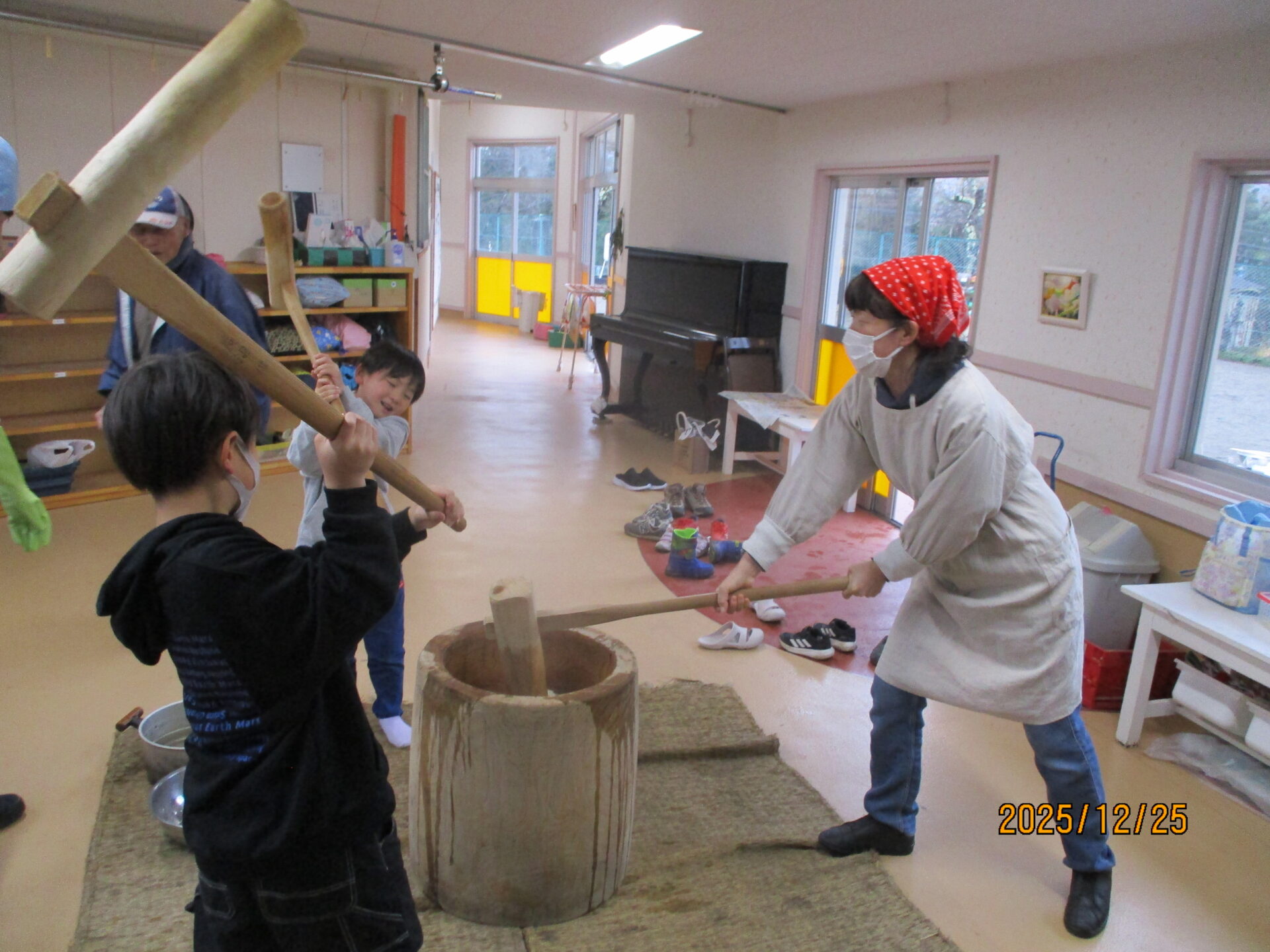 ・地域の方のご協力の下、餅つきと鏡餅作りの体験を行うことができました。餅米を釜で蒸かし、臼と杵で餅つきをする体験は毎年恒例で行っているが、貴重な体験ができている豊栄っこは幸せだな~と改めて感じた。