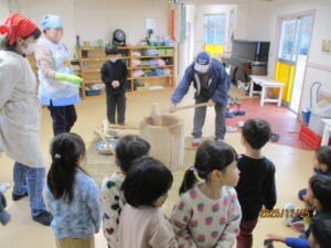 「楽しかった」「ちょっと難しかった」「つかれた」など感想がありましたが、どの子も餅つき体験を喜んでいました。