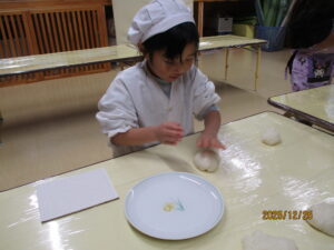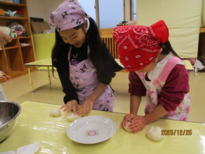 つきたてのおもちを「あついよ~」「手にくっついちゃう」と言いながら楽しんで丸めていました。出来上がった鏡餅はお家に持ち帰り、飾ってもらいました。貴重な鏡餅作りも楽しむことが出来ました。