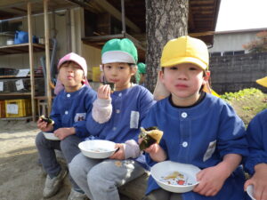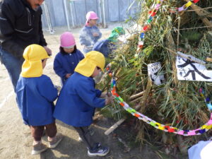 各家庭から正月飾りを持ち寄っていただき、保育園の園庭に「おんべ」を作りました。