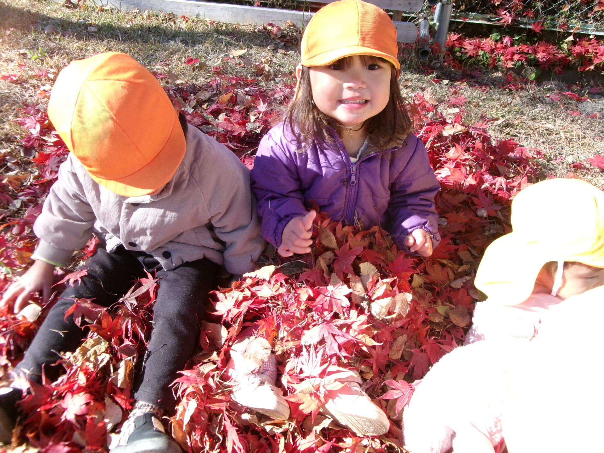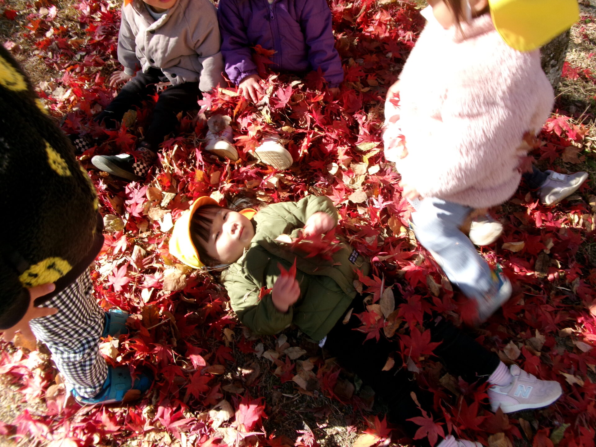 ・落ち葉の色や足で踏んだ時の音、体にかけてみたときの感触など、全身で味わいとても楽しんでいました。